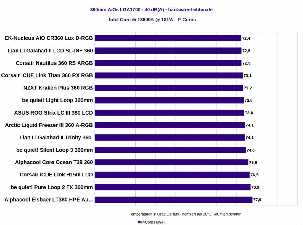 Die vorherigen Top-Modelle bleiben vorn, allerdings schiebt sich die EK-Nucleus recht unerwartet deutlich an die Spitze, danach folgt innerhalb von 2 Grad fast der komplette Rest des Rankings. Lediglich Pure Loop 2 und Eisbaer LT können hier nicht mehr dran bleiben.