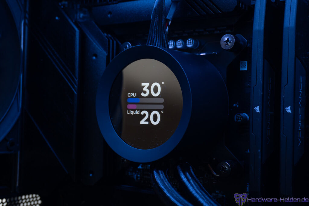 Mit wechselbaren, separat zu erwerbenden Pumpendeckeln (die auch zur H150i passen) gibt es hier Optionen auf einen VRM-Lüfter, das Display oder einfach nur eine Beleuchtung.