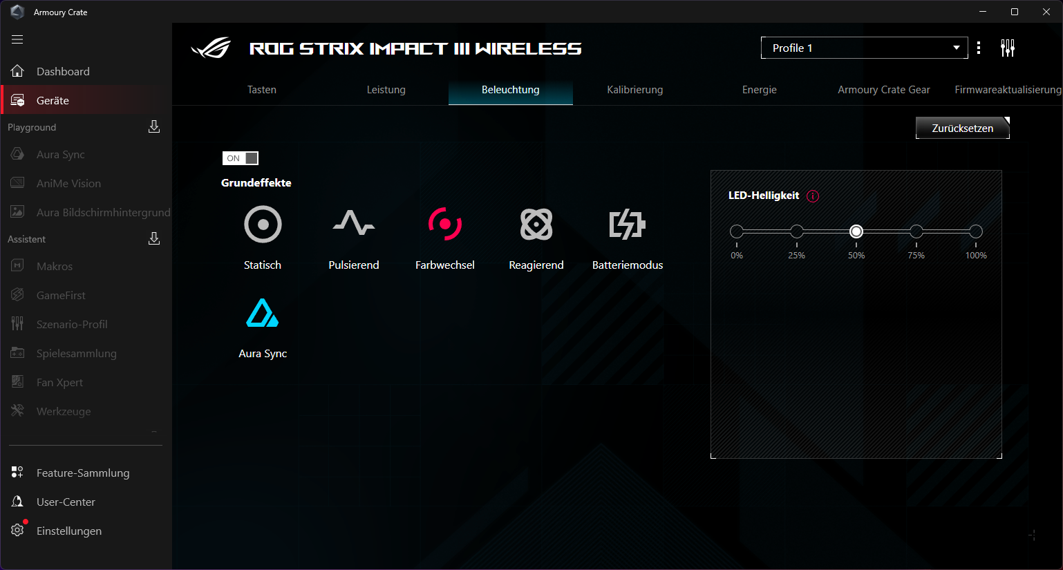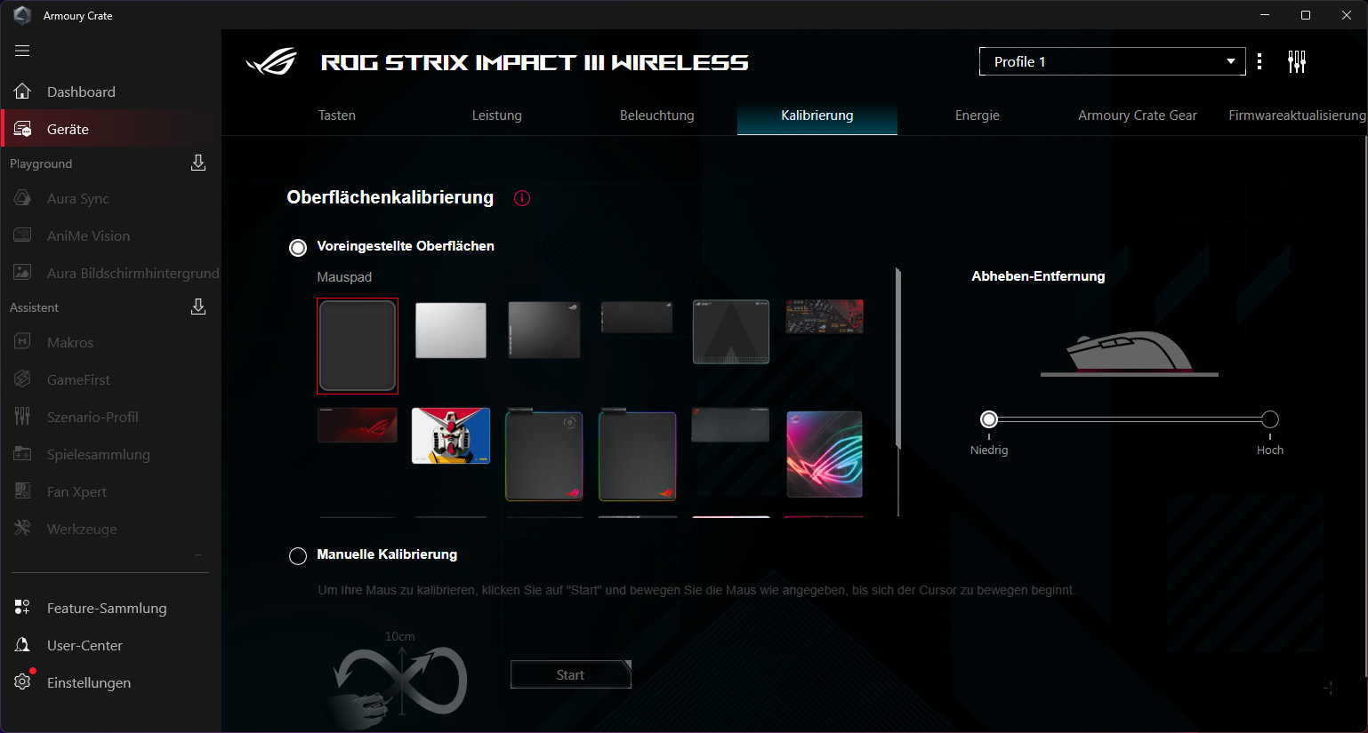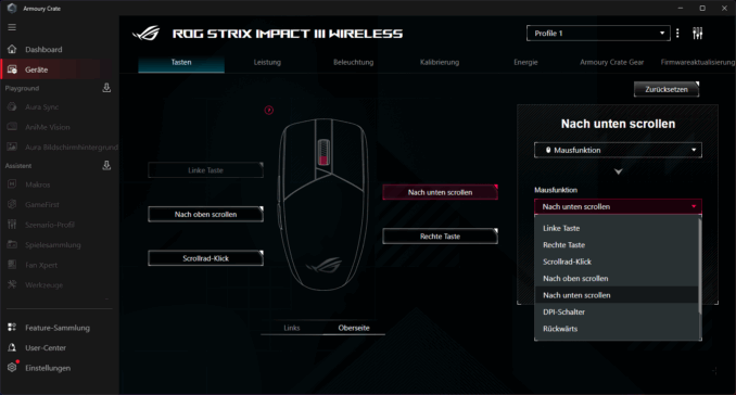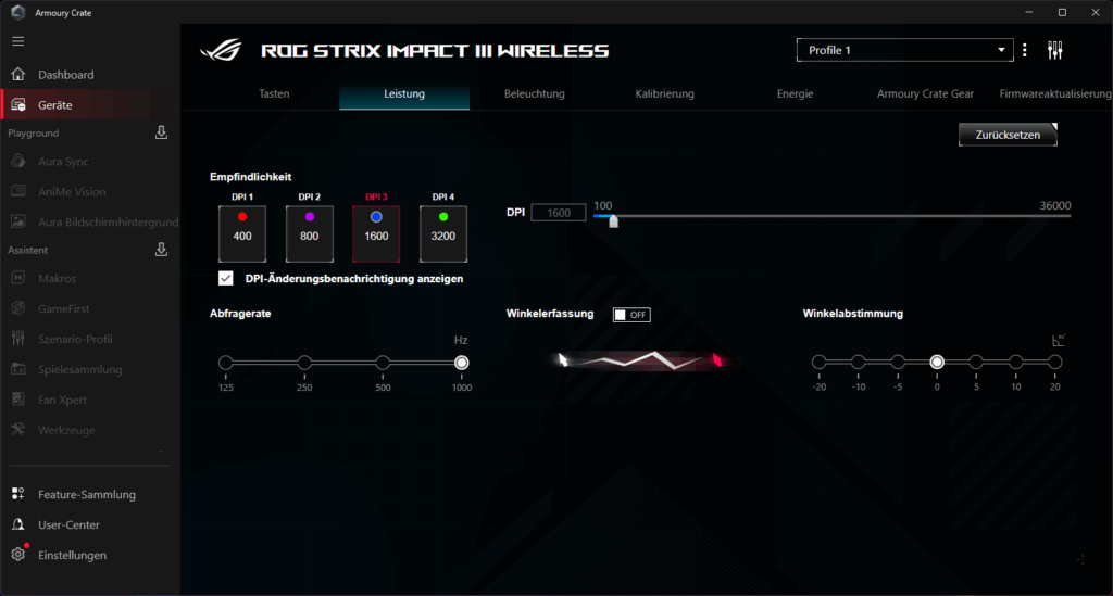 Die Konfiguration erfolgt über die ziemlich überladene ASUS Armoury Crate Software Suite. Hier lassen sich DPI-Stufen, Polling-Rate, Lift-Off-Distanz sowie die Tastenbelegungen anpassen. Auch die RGB-Beleuchtung kann hier individualisiert werden.