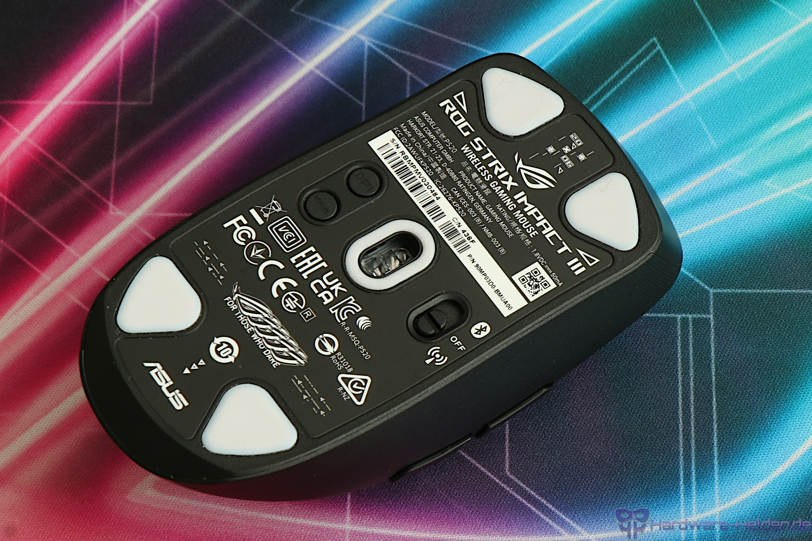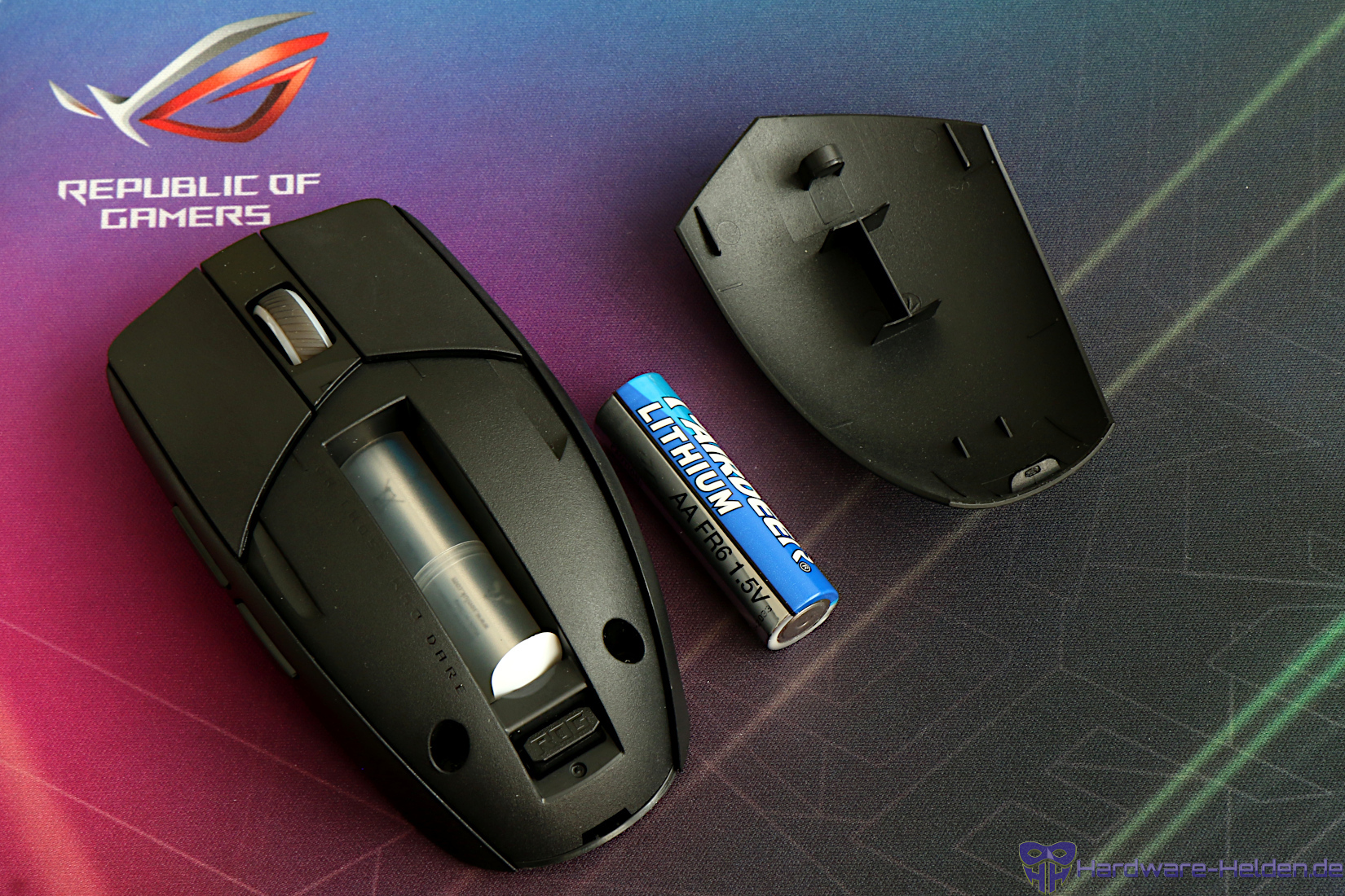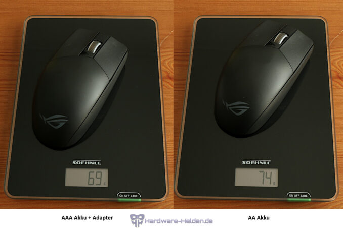 Nicht so gut gefällt uns die auf der Unterseite angebrachte DPI Taste und das die Maus aufgrund des fehlenden USB Ports keinerlei Möglichkeiten für einen optionalen kabelgebunden Betrieb ermöglicht. Unter dem Gesichtspunkt ist auch die Gewichtsangabe von ASUS mit 57 Gramm ohne Akku schlicht irreführend und so kommt die Maus mit Akku-Adapter in unserem Fall auf 69 Gramm und 74 Gramm mit AA Akku.