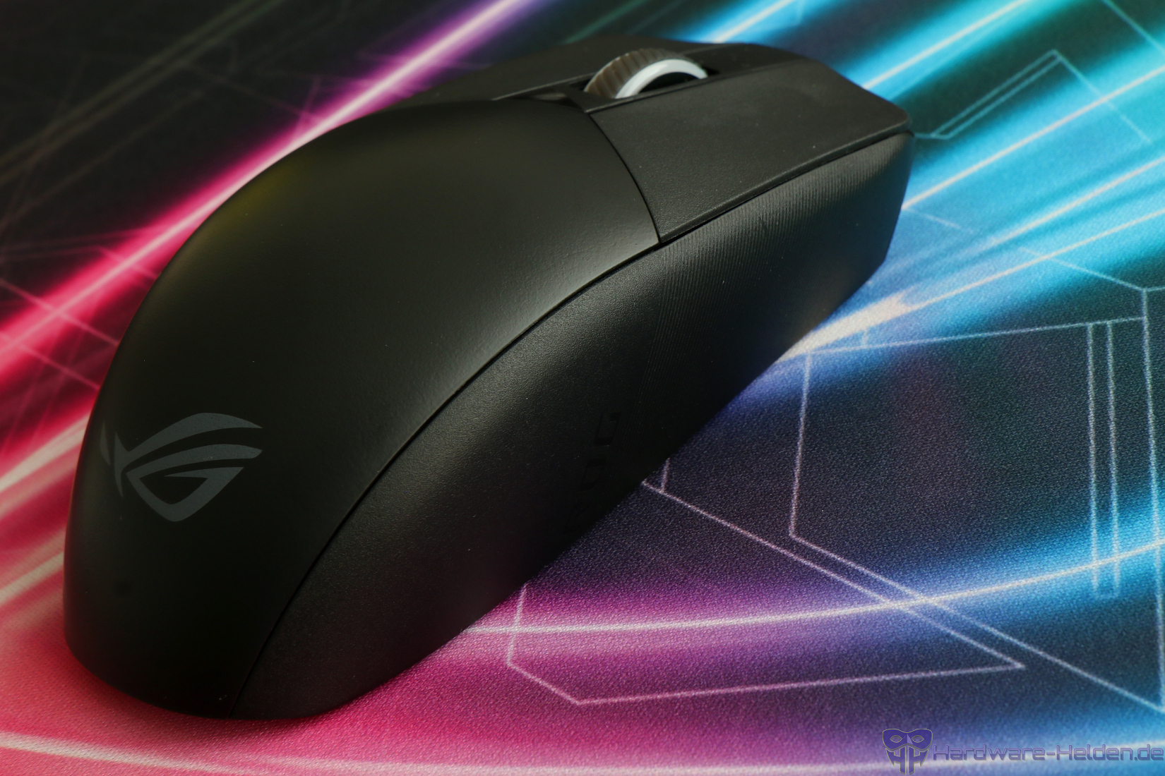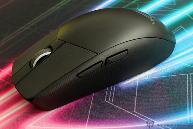Die verbauten ROG Micro Switches bieten ein knackiges, direktes Klickgefühl mit klar definiertem Druckpunkt und das Chassis samt der beiden Haupttasten wirkt insgesamt sehr robust und bietet durch feine Rillen im vorderen Bereich einen guten Grip.