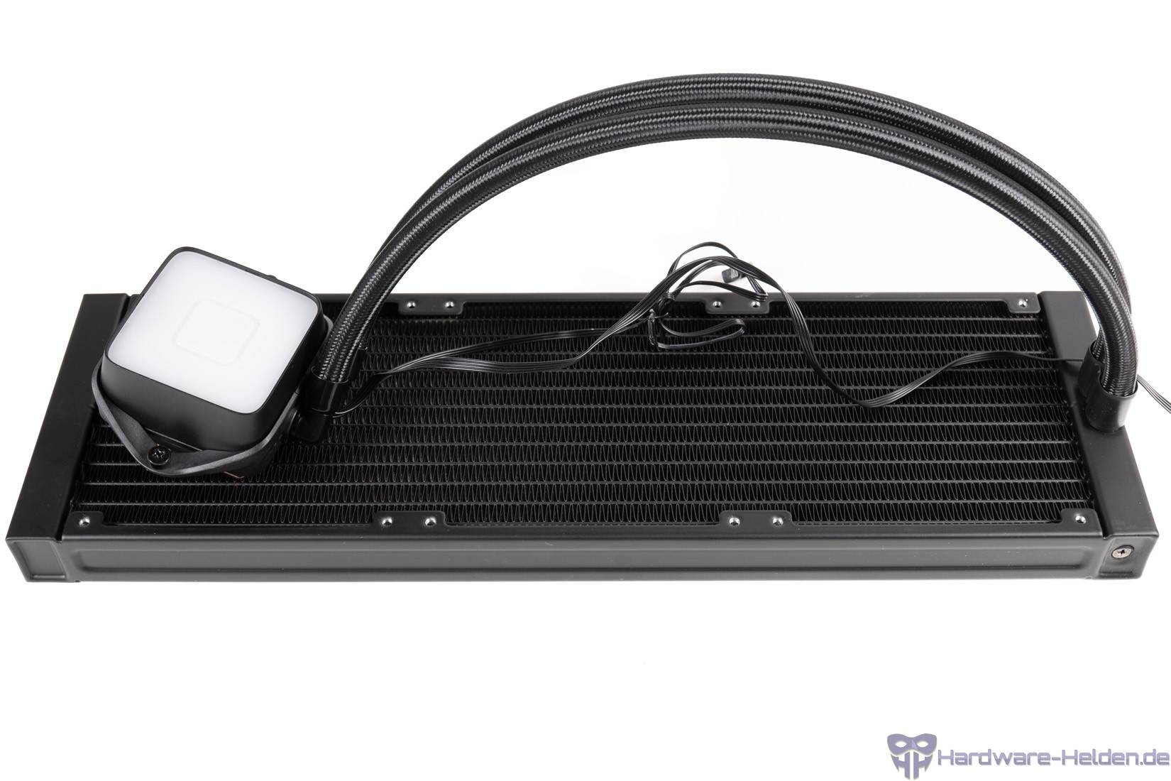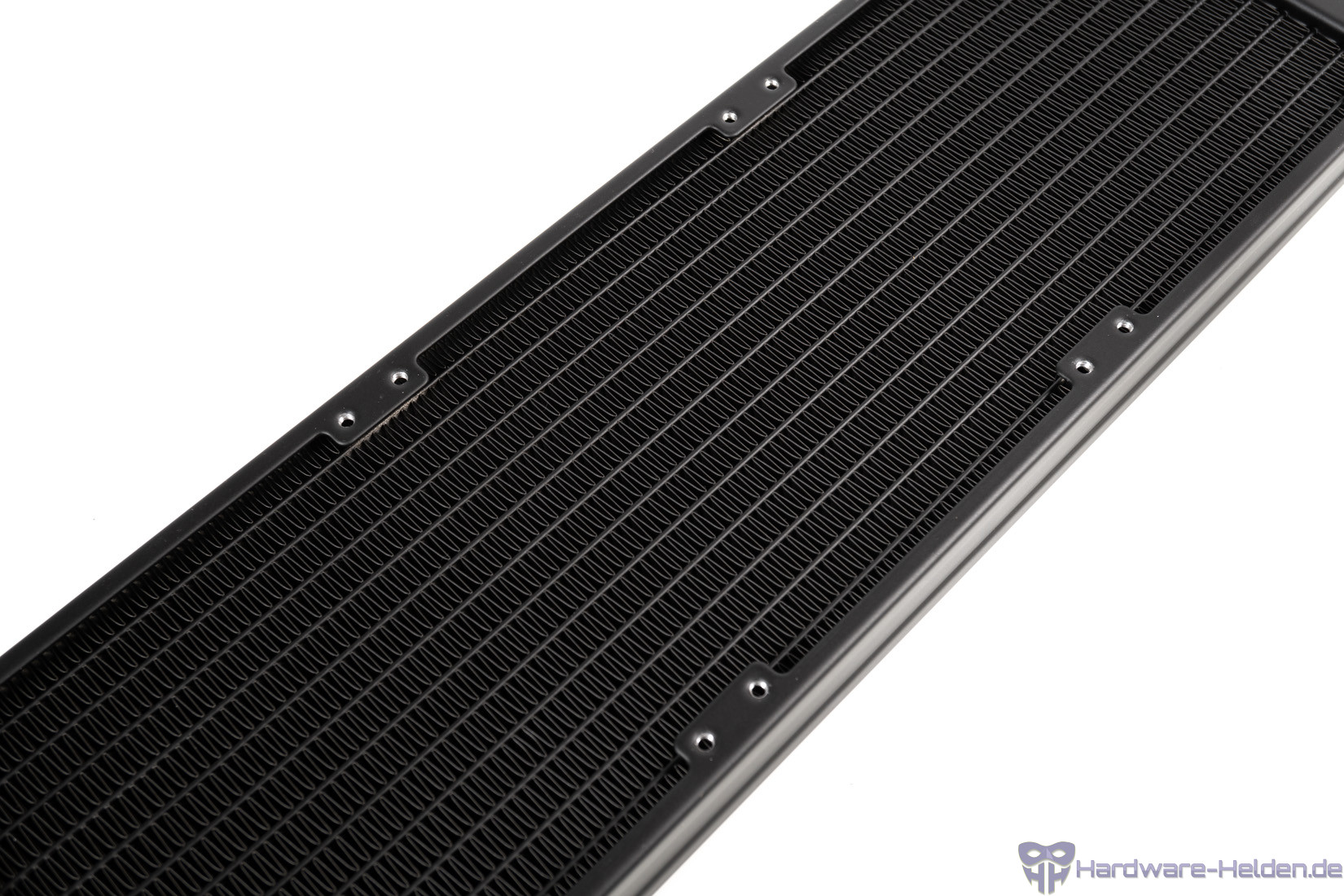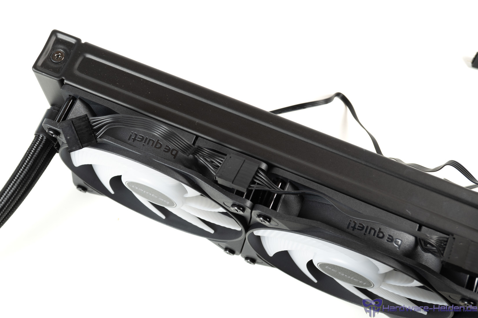 Auf dem gut verarbeiteten, aber weitestgehend schmucklosen Radiator werden die drei Light Wings LX-Lüfter montiert, die in der high-speed Variante ~2100 rpm erreichen können und mit der „Closed-Loop-Motor“-Funktion aufwarten. Ihr großer Drehzahlbereich hinab bis etwas unter 300 rpm ermöglicht es sie sehr leise zu betreiben.