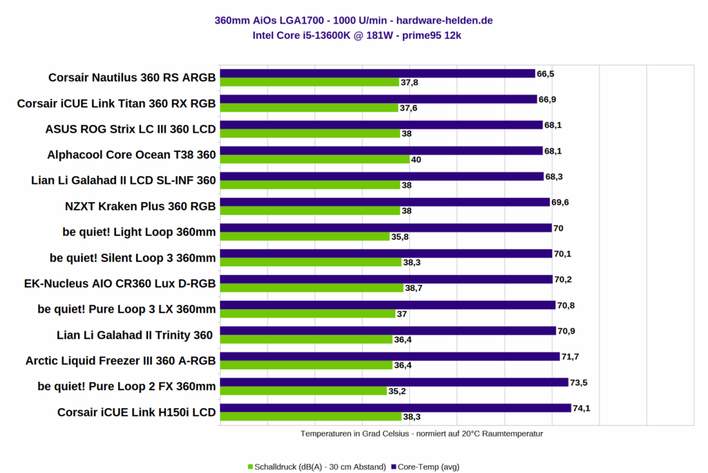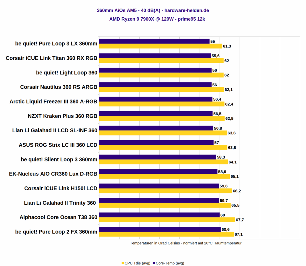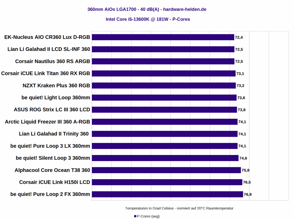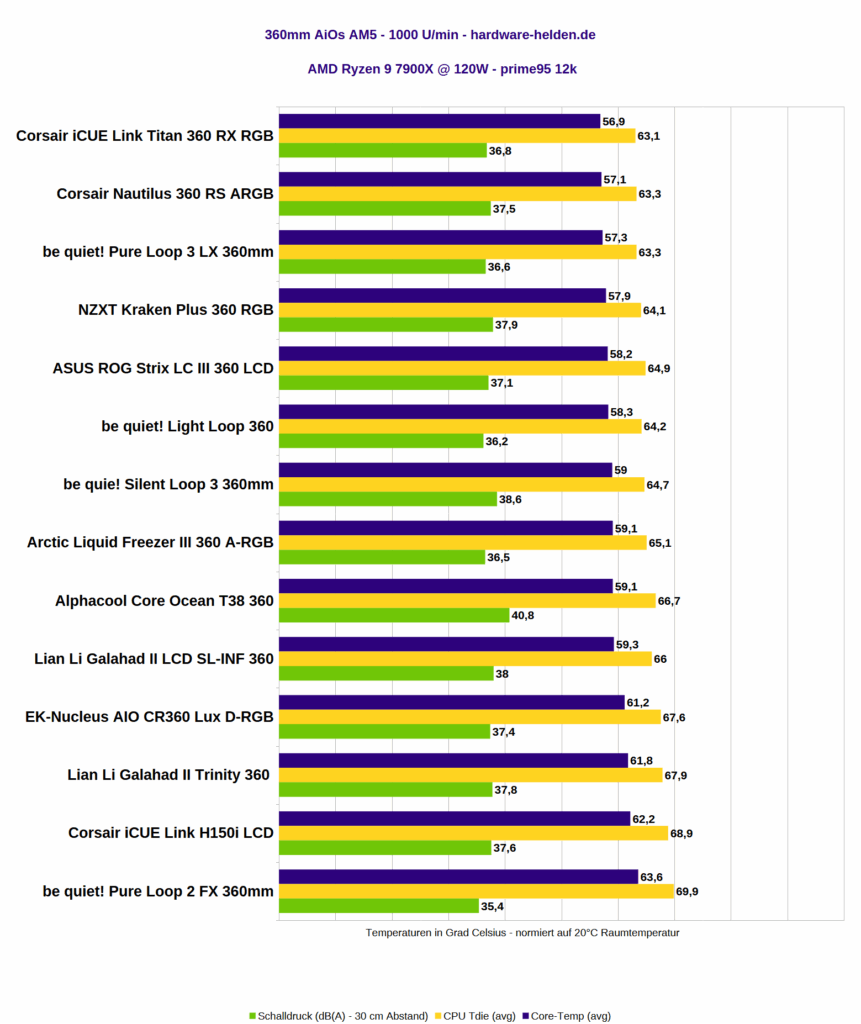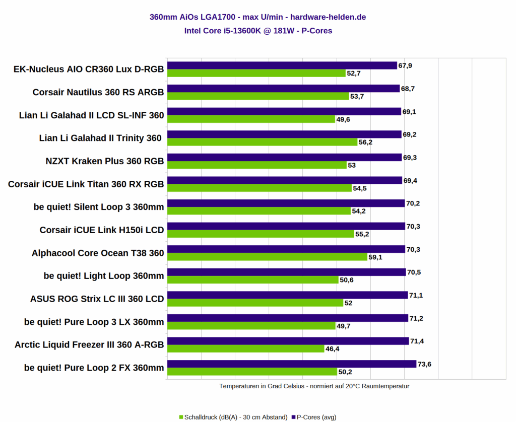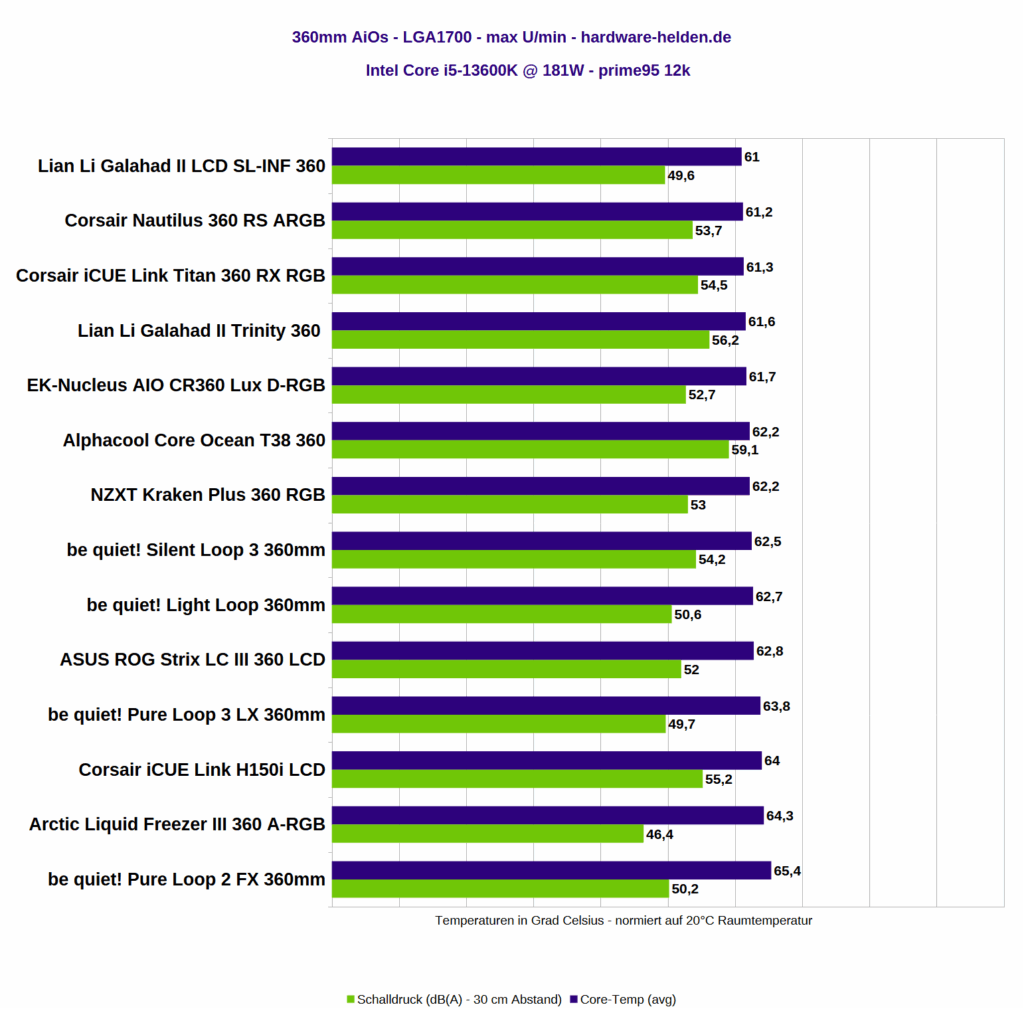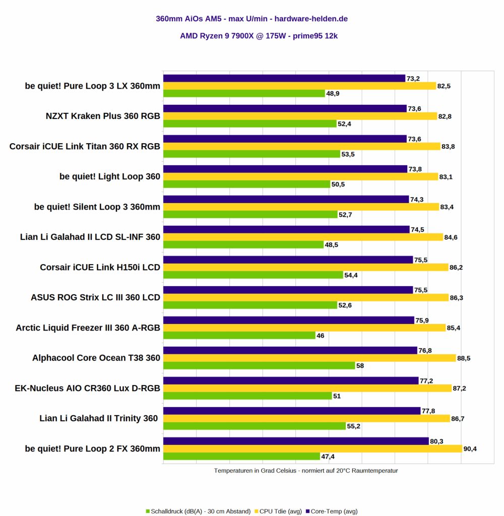 Die Pure Loop 3 LX platziert sich hier eher im hinteren Teil unseres Rankings. Allerdings beträgt der gesamte Abstand in diesem ohnehin nur wenige Grad. Damit ist die Pure Loop 3 LX einerseits eine AiO, die nicht jedes Bisschen aus dem System holt, aber andererseits immerhin minimal weniger laut wird als viele Konkurrenten. Für den Dauerbetrieb aber ohne wenn und aber zu laut. Zum Vorgänger gibt es eine kleine Verbesserung.