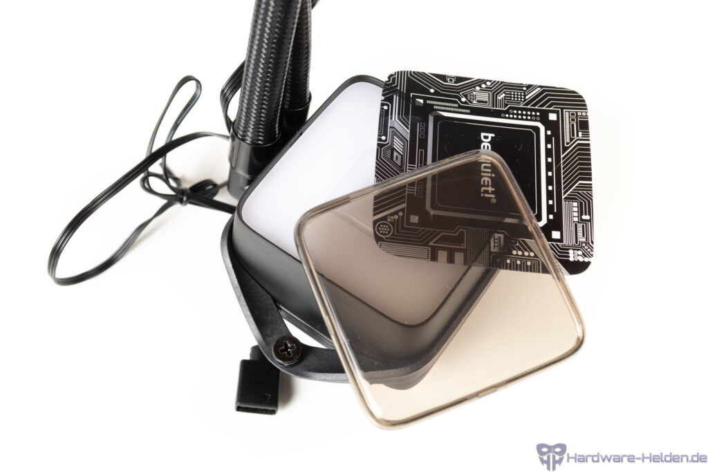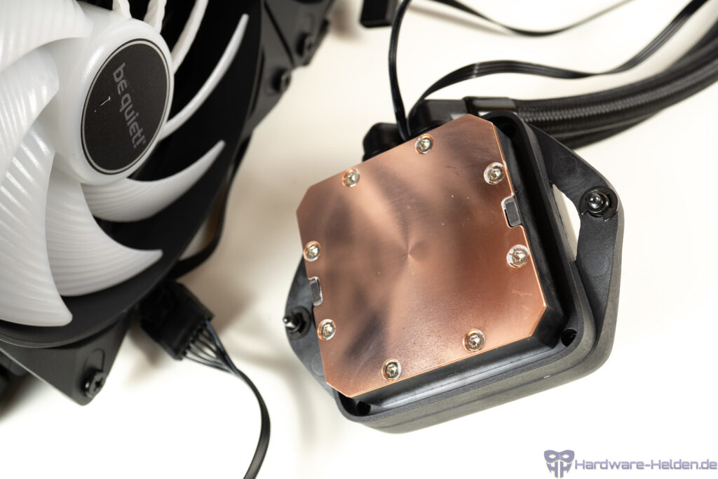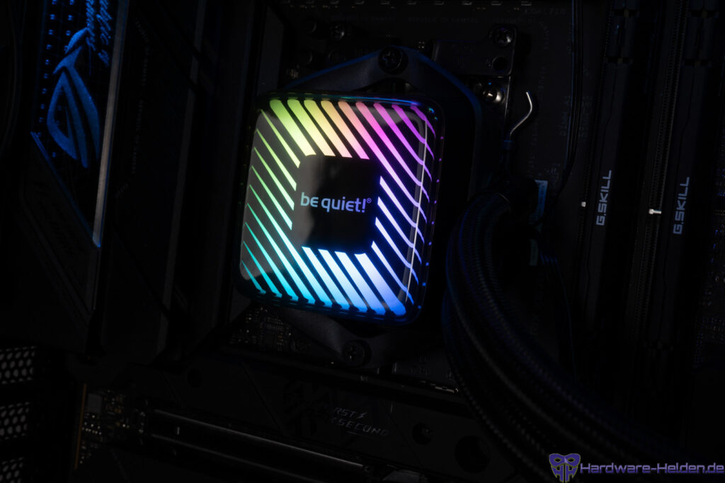 Die Pumpe selbst wird mit einem PWM-Anschluss mit dem System verbunden. Die Beleuchtung zusätzlich getrennt per ARGB-Anschluss. Es gibt allerdings unter dem weißen Deckel eine LED, die immer weiß leuchtet, sobald die Pumpe angeschlossen ist. Dies lässt sich nicht deaktivieren. Der Kühlerboden der Pure Loop 3 LX ist nicht mehr vernickelt.