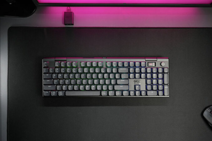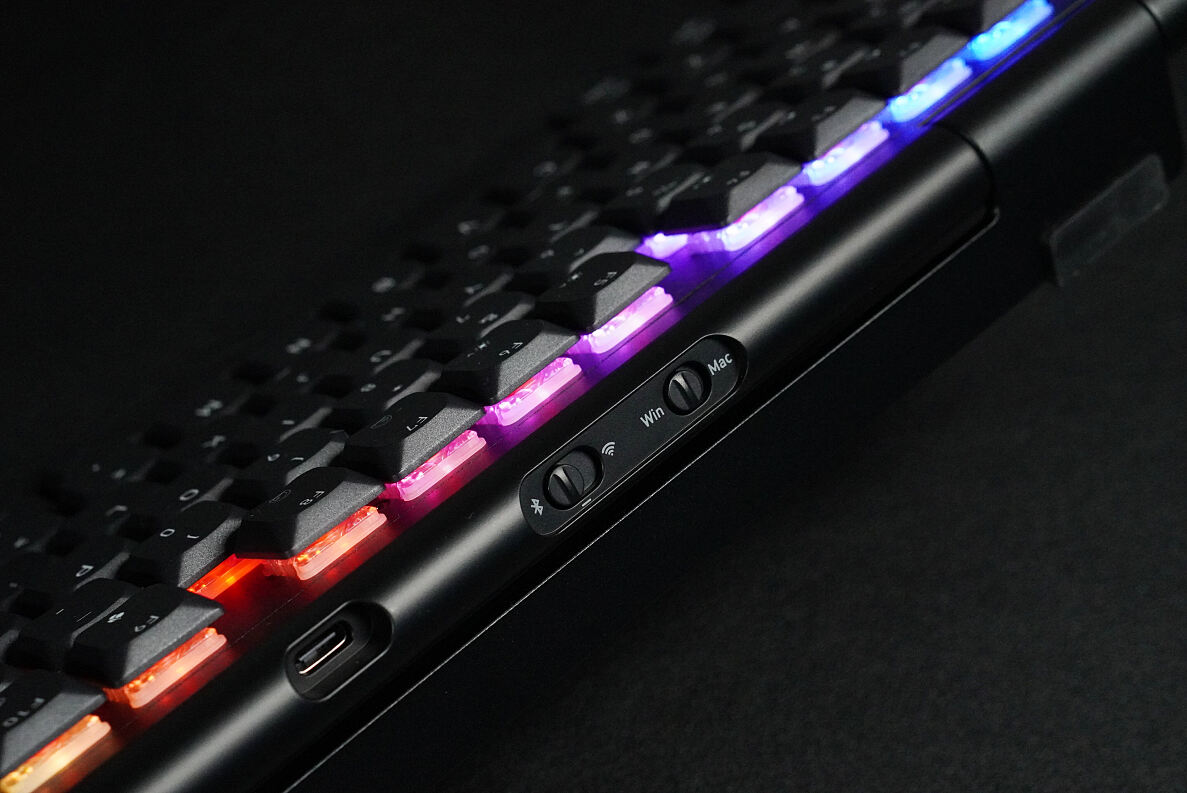 Unter den PBT-Tastenkappen sitzen CHERRY MX LOW PROFILE 2.0-Switches, die eine Lebensdauer von über 100 Millionen Tastenanschlägen bieten sollen und bei denen ein Schmiermittel aufgetragen wurde. Eine RGB-Beleuchtung bietet die Tastatur ebenfalls.