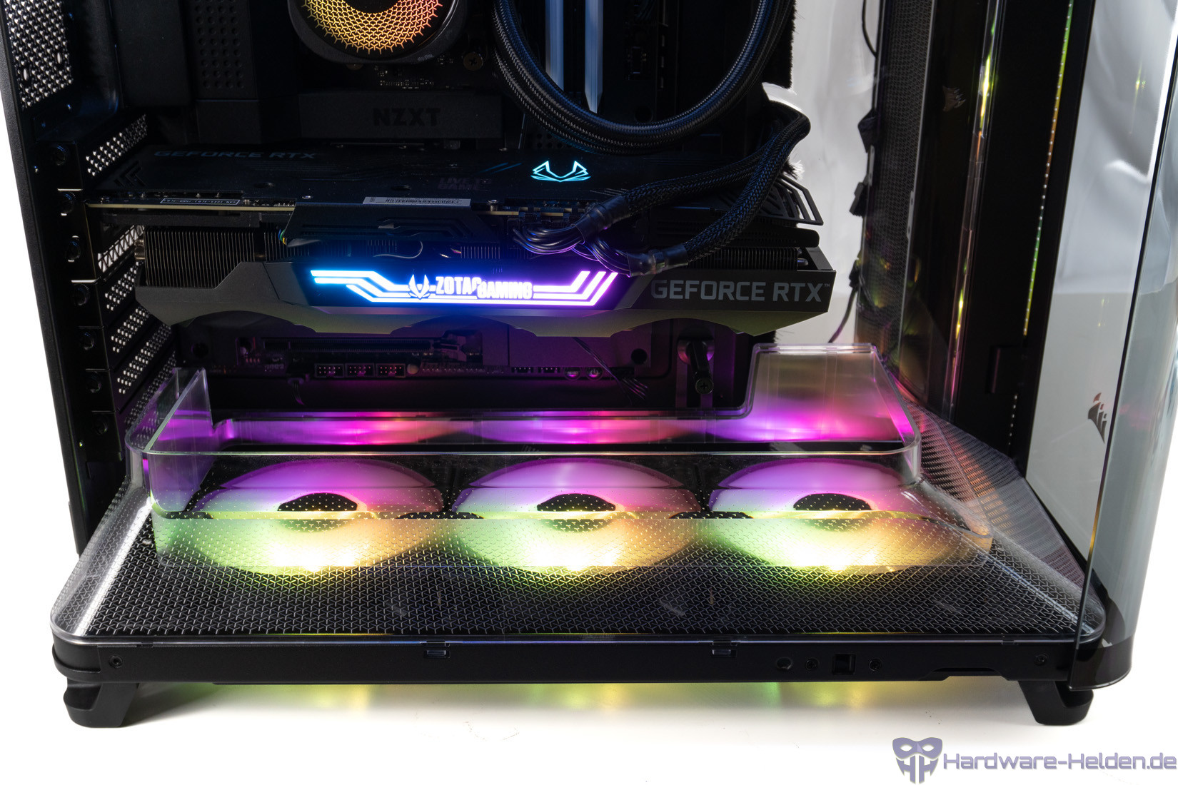 Der Innenraum der Hauptkammer ist eigentlich typisch wären da nicht die großen transparenten Luftführungen aus Plastik. Diese sollen den Luftstrom gezielter auf die Grafikkarte richten. Wir haben dessen Wirkung allerdings nicht wirklich nachvollziehen können und nur minimale Unterschiede erreicht. Ohne den Luftführungstrichter unten stieg die GPU-Temperatur um ca. 1 Grad. Das konnten wir in je zwei Messungen beobachten, liegt aber trotzdem locker in der Toleranz. Bei anderen Systemen und Szenarien könnte das vielleicht anders aussehen.