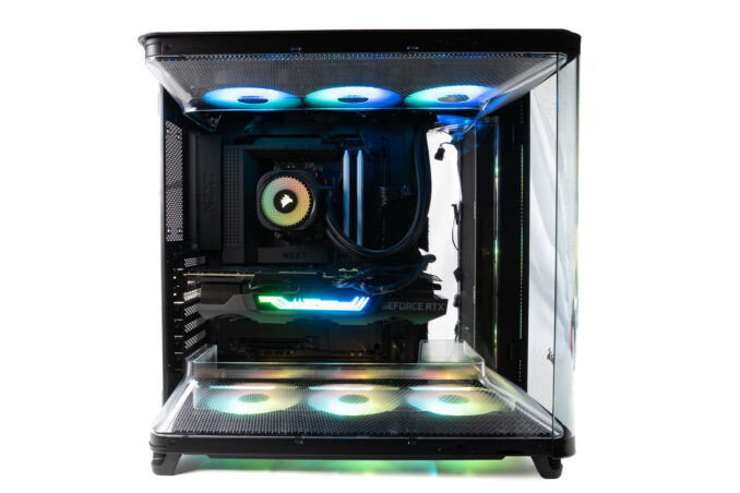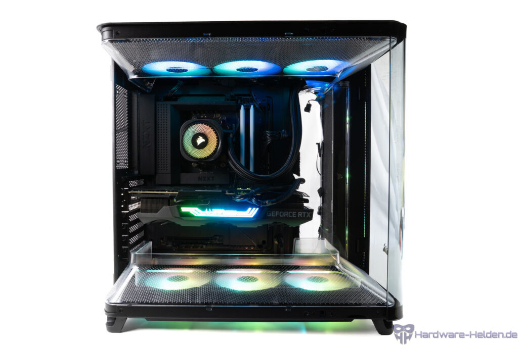 Die Lüfter haben wir auf ca. 36 dB(A) reguliert, was in etwa 1000 U/min sowohl bei den Gehäuselüftern als auch der AiO entspricht. Die GPU-Lüfter wurden bei 65% betrieben.