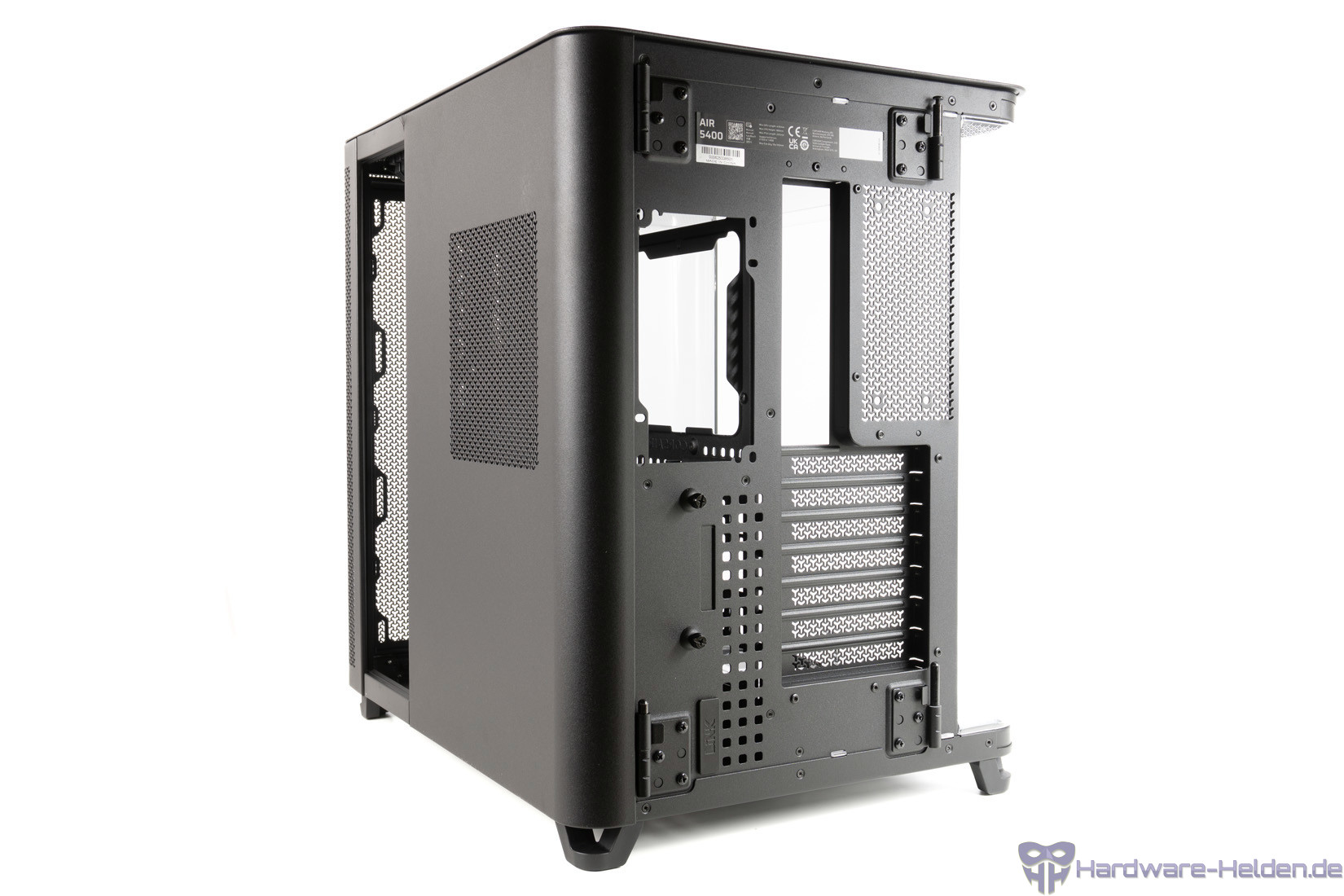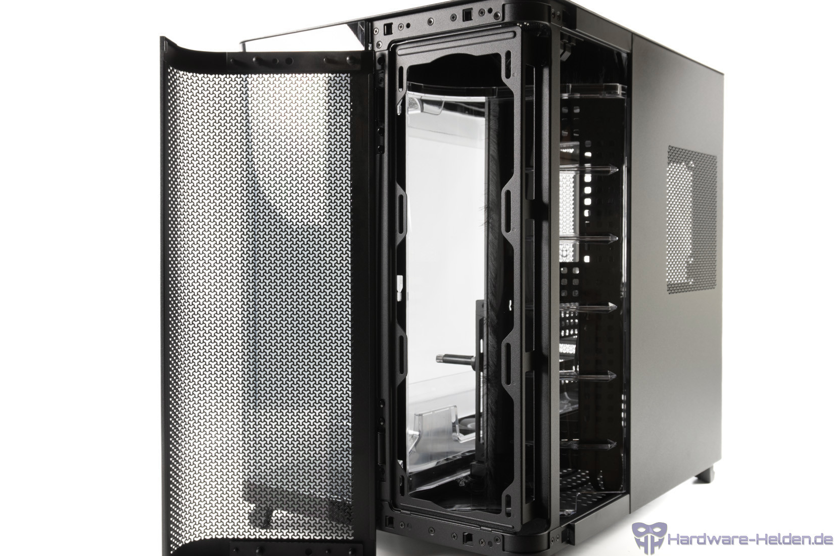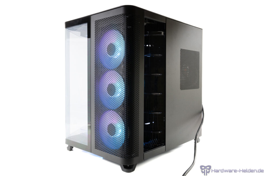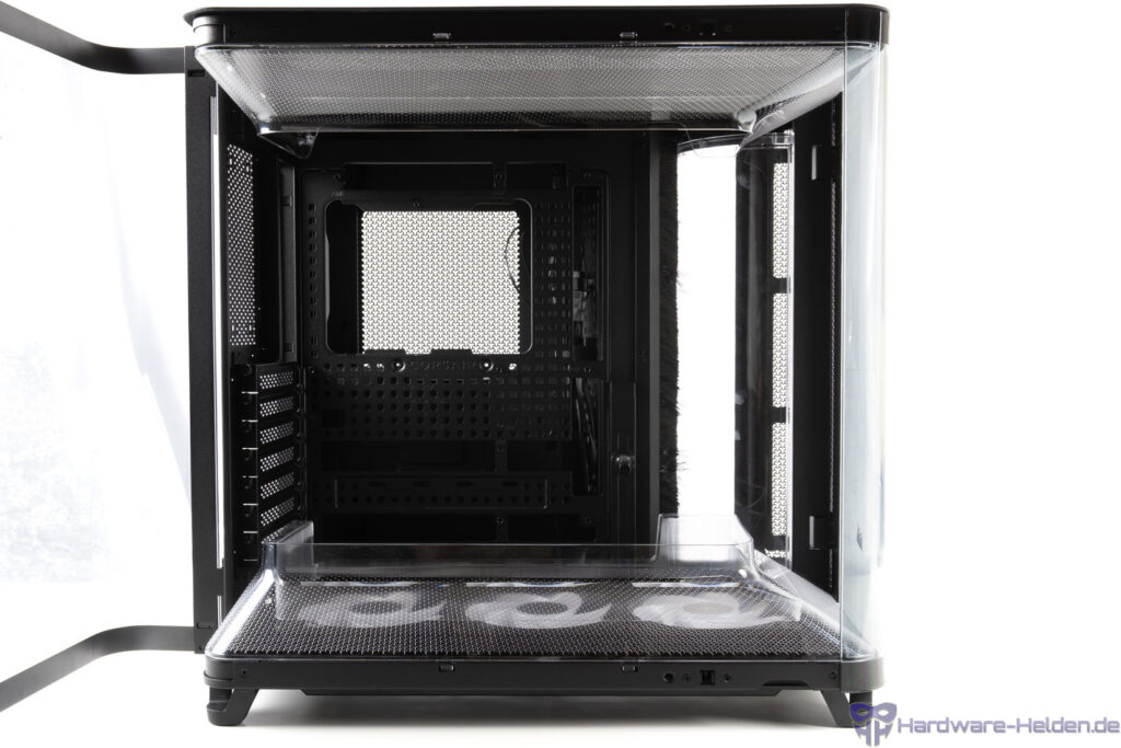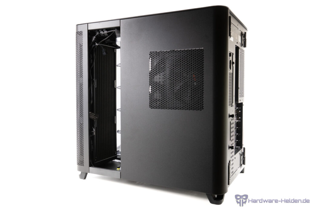 Der Rest der rechten Seite aus Stahl ist ebenfalls als Tür realisiert und gibt somit leichten Zugriff. Auf Höhe des Netzteils ist die Fläche gelocht.