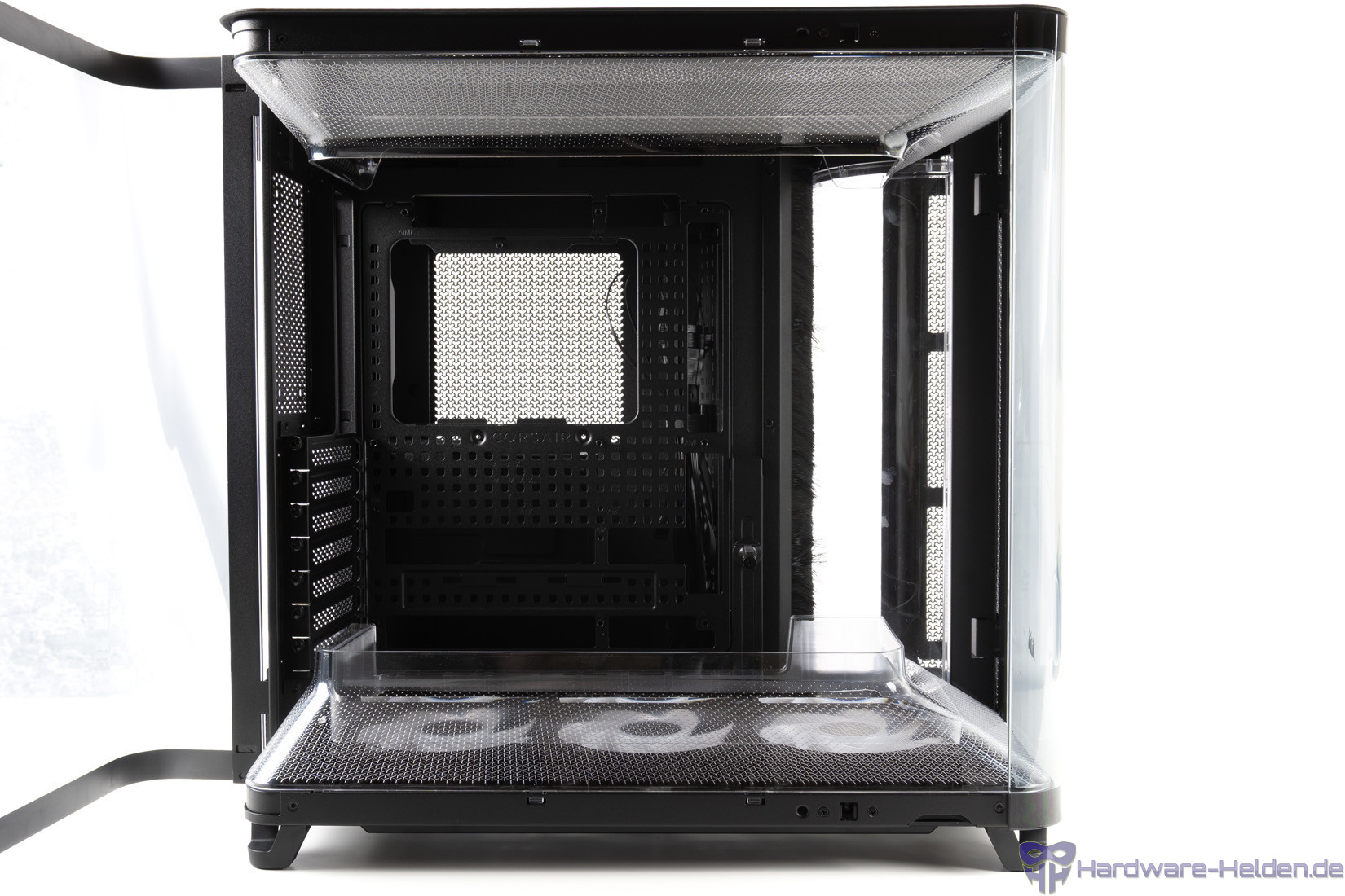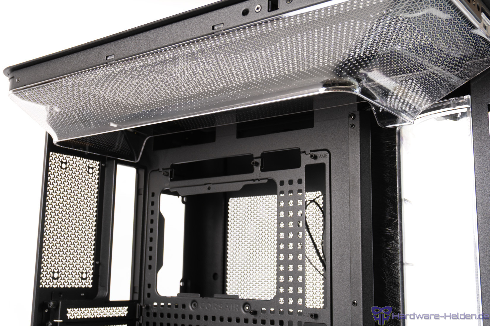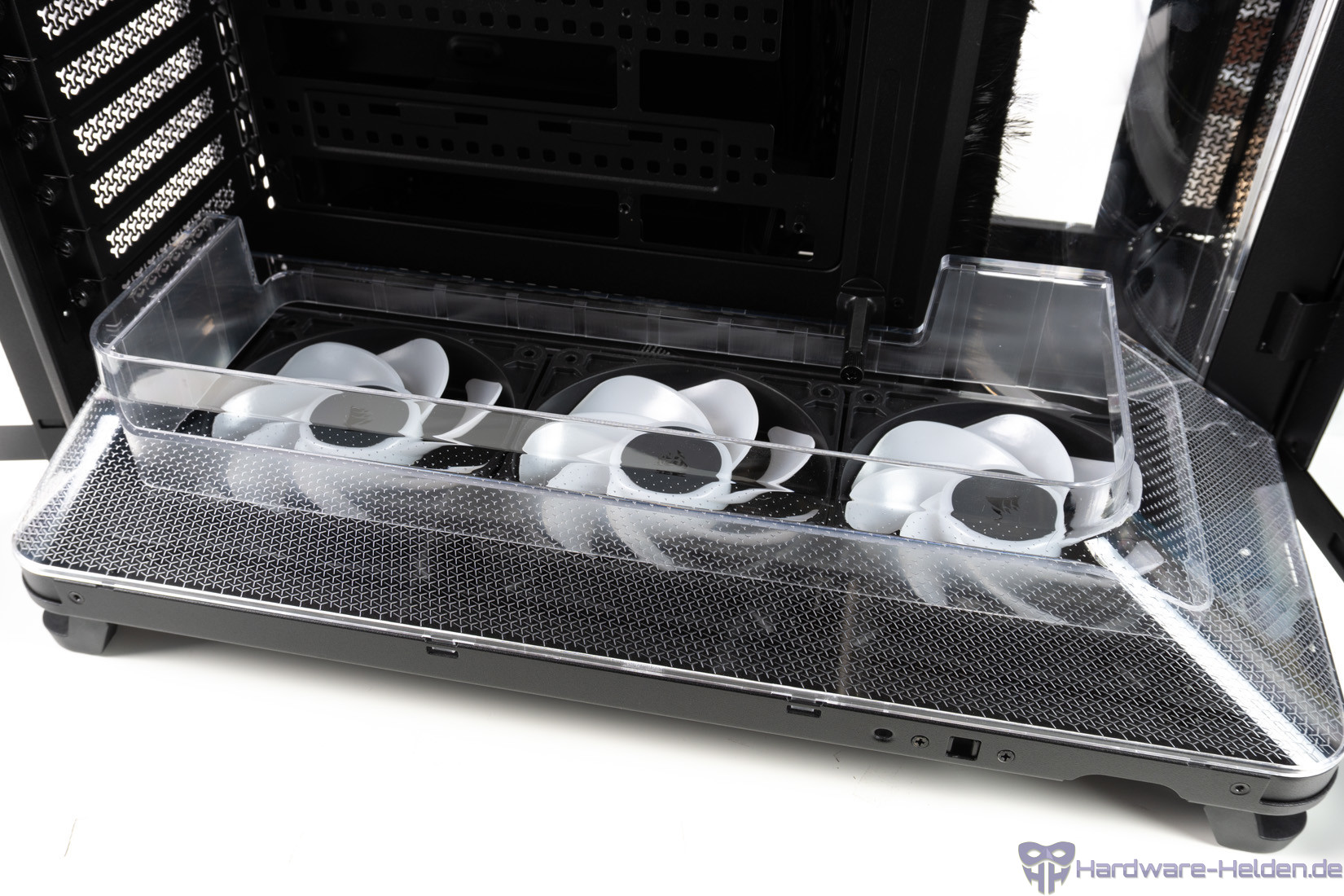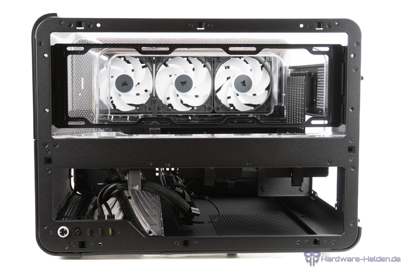 Der Deckel kann einfach abgezogen werden, um Zugriff auf die Lüfterhalterung darunter zu erhalten. Im rechten Teil sind die Anschlüsse integriert, wobei man bei einem derartigen Showcase über untenliegende Anschlüsse hätte nachdenken können. Ungewöhnlich ist, dass Corsair vollständig auf USB-A-Anschlüsse verzichtet und gleich drei USB-C-Anschlüsse anbietet. Zwei davon sind allerdings mit dem internen USB-3.0-Anschluss auf dem Mainboard verbunden und erreichen entsprechend maximal 5 Gbit/s. Ganz frei von Kritik ist das Design nicht, da sich USB-A-Sticks oder ähnliches so nicht direkt am Frontpanel verwenden lassen.