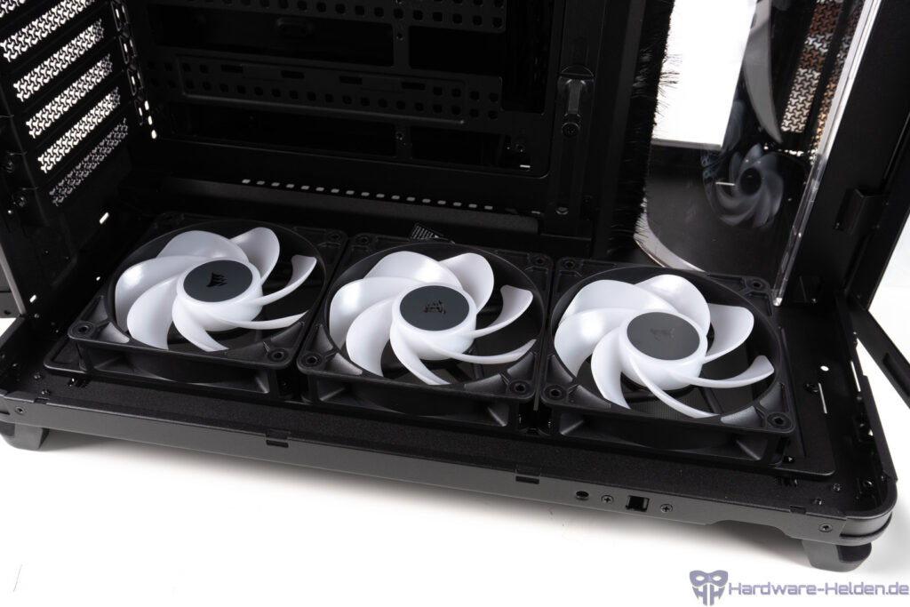 Im Vergleich zum soliden Stahl und Glas des Gehäuses wirken die Plastikelemente nicht unbedingt hochwertig und für uns wenig ansprechend. Wenn sie stören, kann man sie aber einfach herausnehmen. Die Luftführung in der AiO-Kammer hätte nach unserem Geschmack ein schwarzes Stahlelement sein dürfen, das robuster wäre und zudem die Verkabelung verstecken würde, die so aufwändiger zu kaschieren ist. Bei den verbauten Lüftern handelt es sich um die bekannten Corsair RS-R ARGB im Reverse-Layout und 120-mm-Format. Diese verfügen über einen ZeroRPM-Modus und rotieren zwischen 420 und 2100 rpm. Zur (De)Montage der Lüfter kann der Rahmen ausgebaut werden.