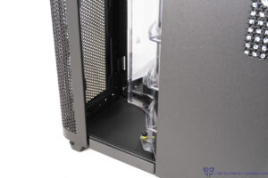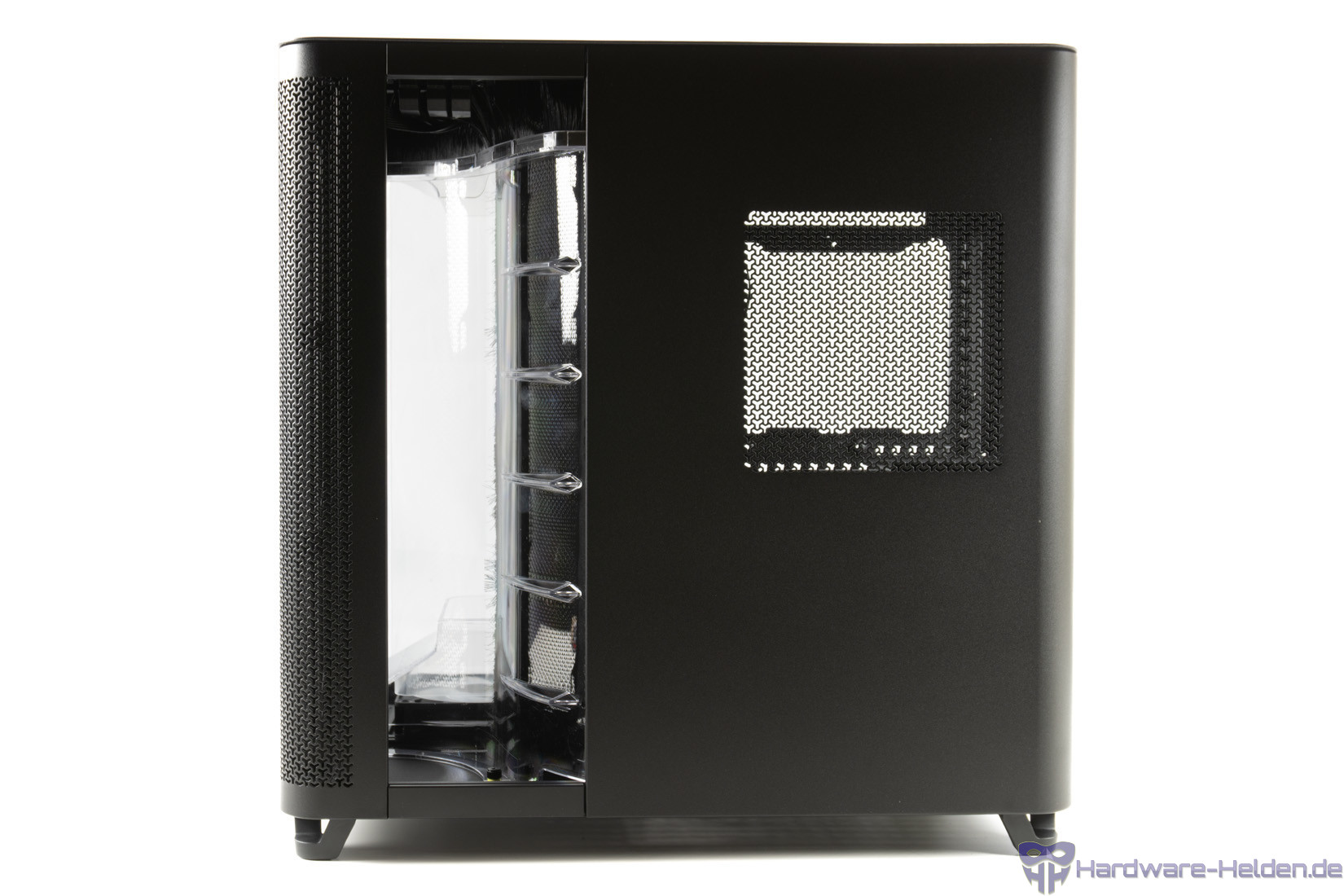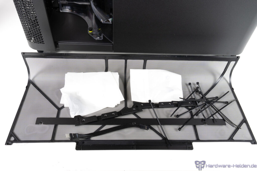 Die Kammer rechts ist mit einem um die Ecke laufenden Lüftergitter abgedeckt, das einfach abgezogen werden kann. Dahinter verbirgt sich die speziell für eine AiO-Wasserkühlung gedachte Montageposition. Die Halterung kann über zwei Schrauben entfernt werden.