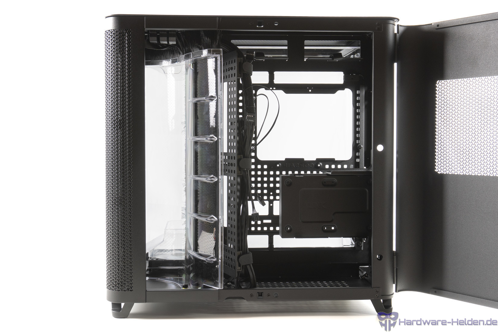 Der Mainboard-Träger stellt wieder das RapidRoute 2.0-System bereit, also das Stecksystem an dem Kabelhalterungen flexibel an dem gelochten Stahl angesteckt werden können. Die Rückseite bietet viel Platz für Kabel. Noch mehr, wenn man den modularen HDD-Träger ausbaut. Er ist jedoch die einzige Möglichkeit 2.5- und 3.5 Zoll-Laufwerke zu verbauen und kann auch genutzt werden um einen Corsair iCUE-Link Hub (in dieser Variante nicht enthalten) zu befestigen.