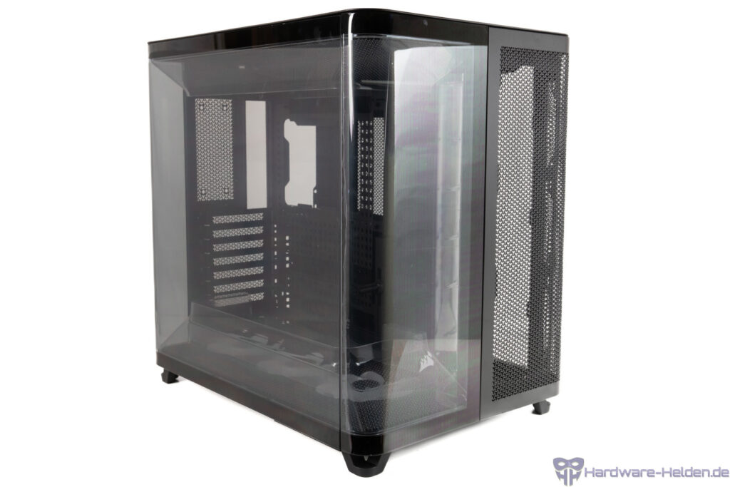 Das Corsair Air 5400 RS-R ARGB sieht auf den ersten Blick wie ein typisches Zwei-Kammer-Gehäuse aus, bietet jedoch drei Kammern und auch ein paar weitere Besonderheiten. Sowohl die gläserne und elegant gebogene Front als auch die große Glasseite sind Türen und können somit ganz bequem geöffnet werden, um Zugriff auf den Innenraum zu bekommen. Die große Seitentür sollte man jedoch entfernen, wenn man das Gehäuse hinlegt. Dazu muss nur eine Schraube entfernt werden.