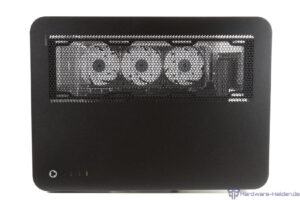 Das Heck verrät im Wesentlichen den inneren Aufbau. Sollte man an dem schmalen Gitter einen 120-mm-Lüfter befestigen wollen, so muss man auf die Streben aus dem Lieferumfang zurückgreifen. Der Lüfter wird dann allerdings deutlich von der umlaufenden Scheibe verdeckt und dürfte nur in wenigen Fällen Sinn ergeben, wenn unbedingt ein Luftstrom in dem Bereich erzielt werden soll.