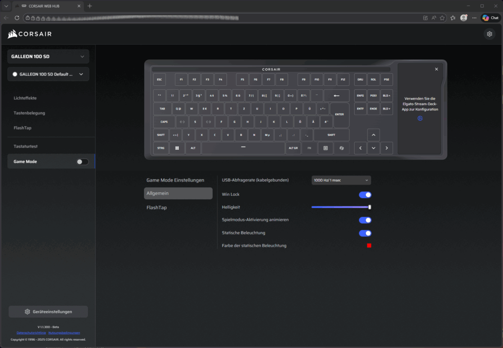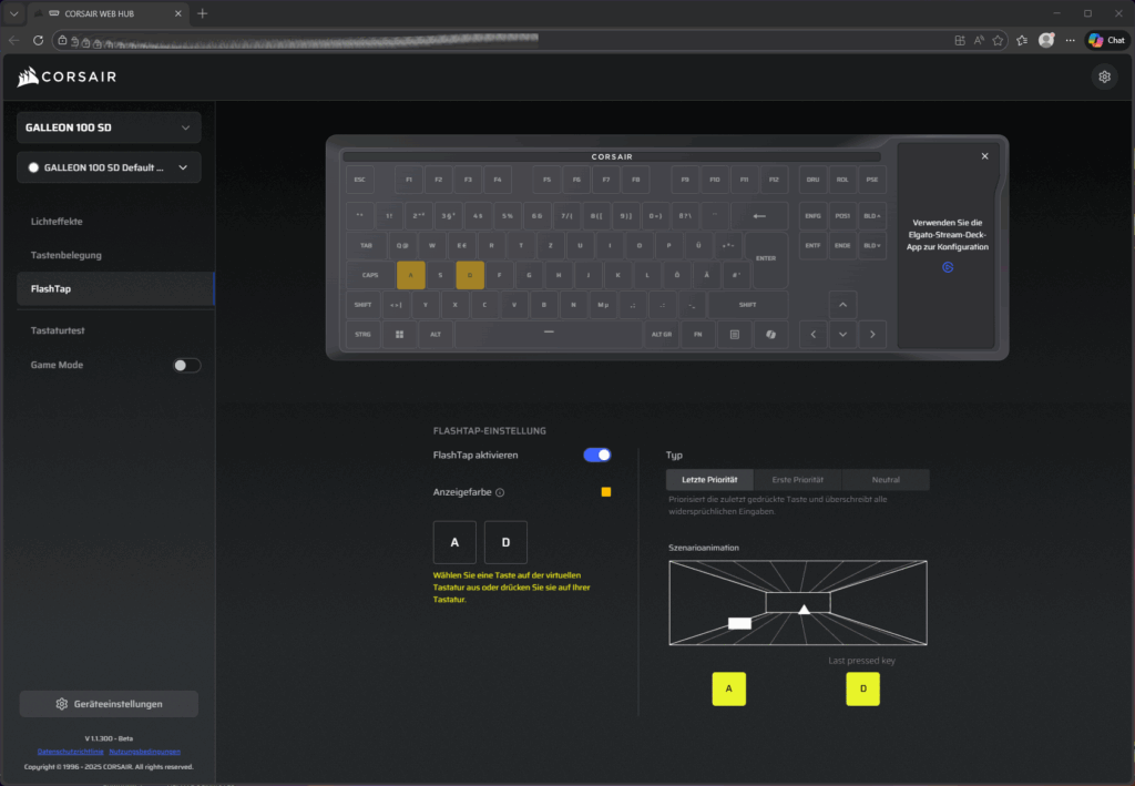 Die Tastatur unterstützt eine Polling rate von bis zu 8000Hz und unterstützt auch wieder die FlashTap Funktion. Separate Mediatasten gibt es wie bei den letzten getesteten Corsair Tastaturen als Zweitbelegung oder alternativ auch im Stream Deck.