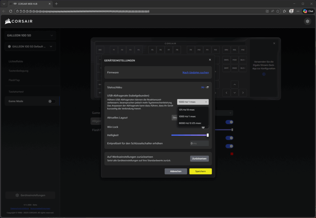 Im Einstellungs-Menü lässt sich noch die Firmware updaten sowie die Polling rate und die Layout Sprache festlegen.