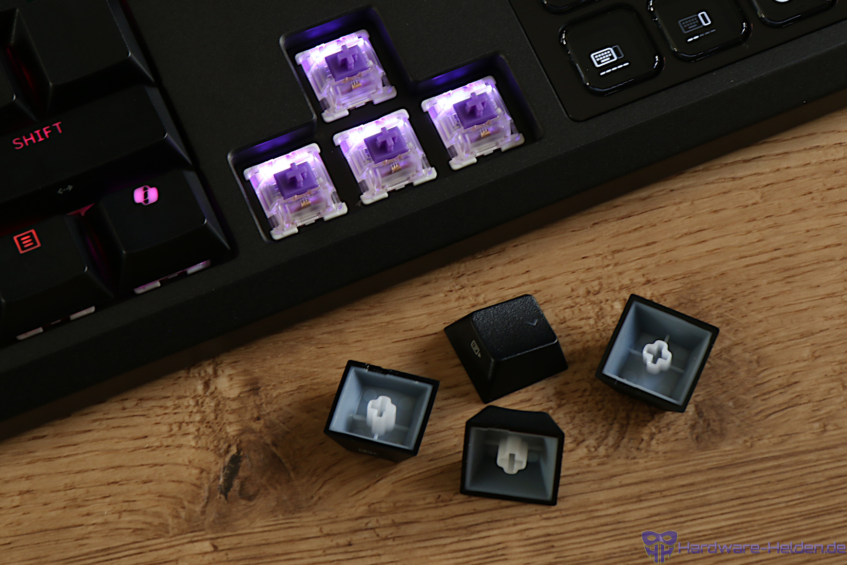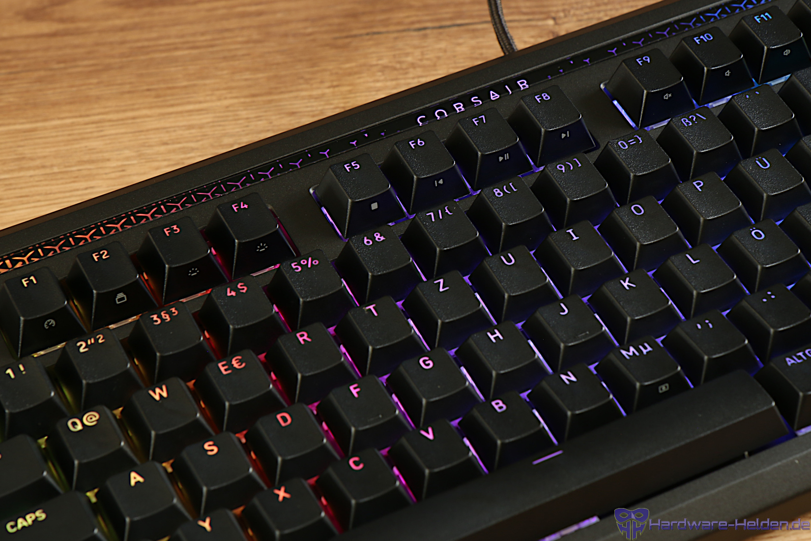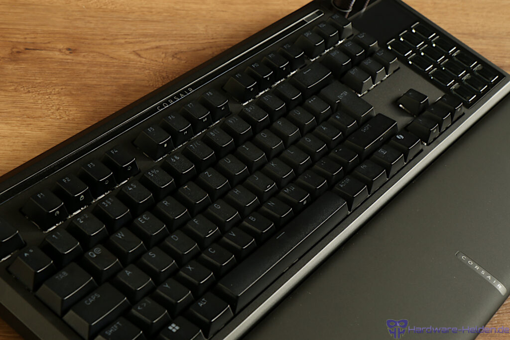 Die Tastenmechanik ist durch vorgeschmierte Corsair MLX Switches realisiert. Die Tasten haben dabei eine lineare Charakteristik mit einer geringen Betätigungskraft von 45g bei 3.8mm Hub. Dank Hotswap Platine lassen sich die Switches mühelos entfernen und durch passende 3- bzw. 5-pin Modelle ersetzen. Das ist nicht nur im Falle eines Defekts nützlich, sondern auch wenn man spezielle Ansprüche an die Tastenmechanik hat.