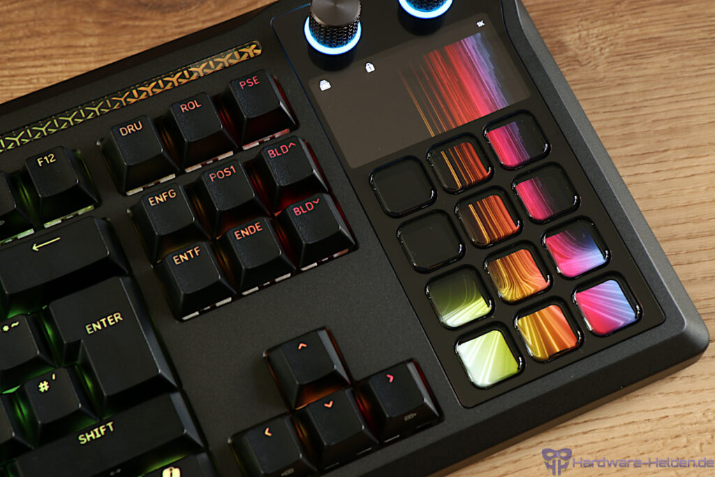 | Besonderheiten | -magnetische Handballenauflage -gedämmtes Tastenbett -ELGATO Stream Deck integration -5″ LCD Display -Hot-Swap Platine |