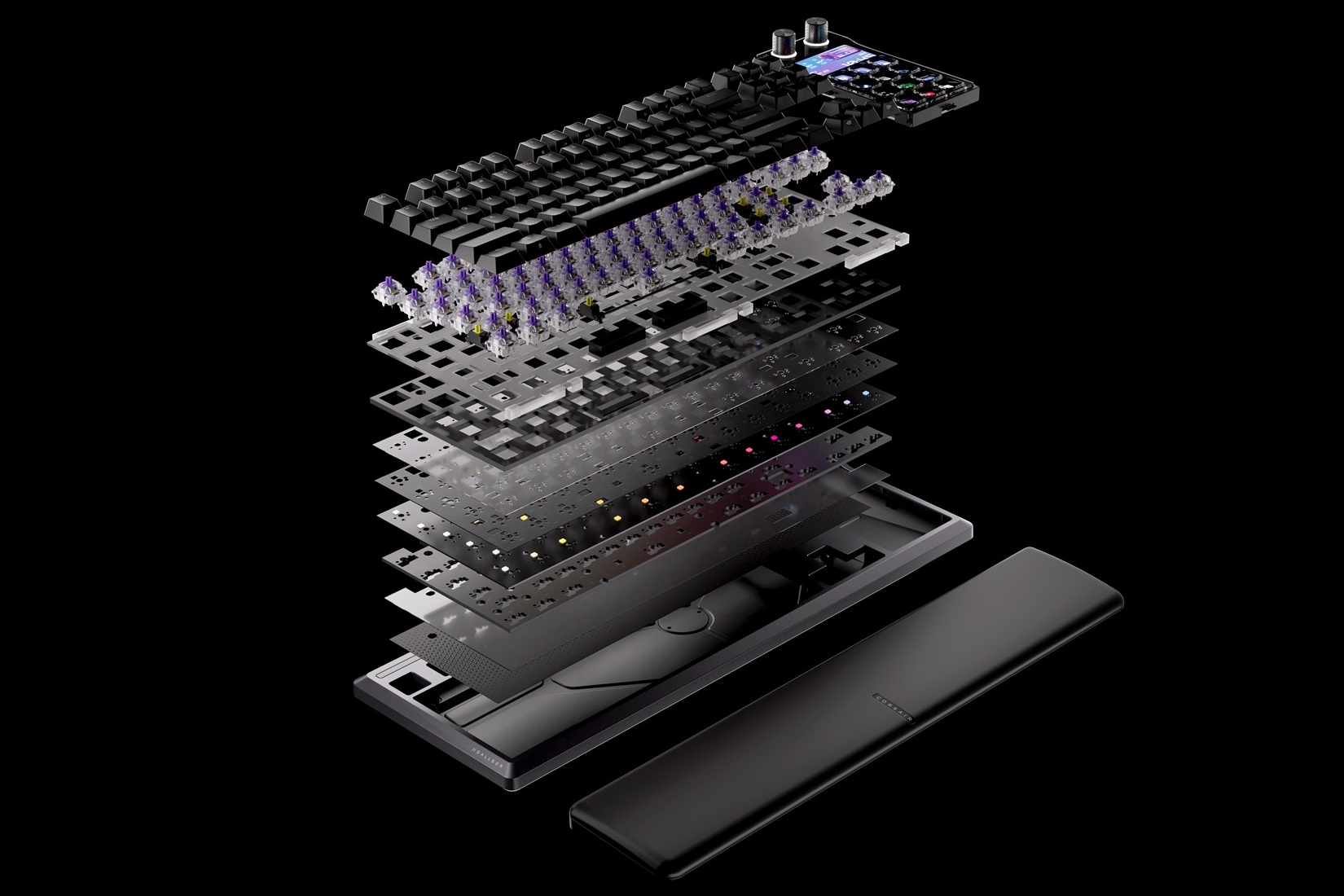 Verschiedene Schichten an Dämmmatten im Inneren sowie vorgeschmierte MLX Pulse Switches in Kombination mit langlebigen PBT Tastenkappen sollen für ein hochwertiges und leises Tippgefühl sorgen. Die Ergonomie kann auf Wunsch mit der im Lieferumfang enthaltenen magnetischen Handballenauflage erweitert werden.