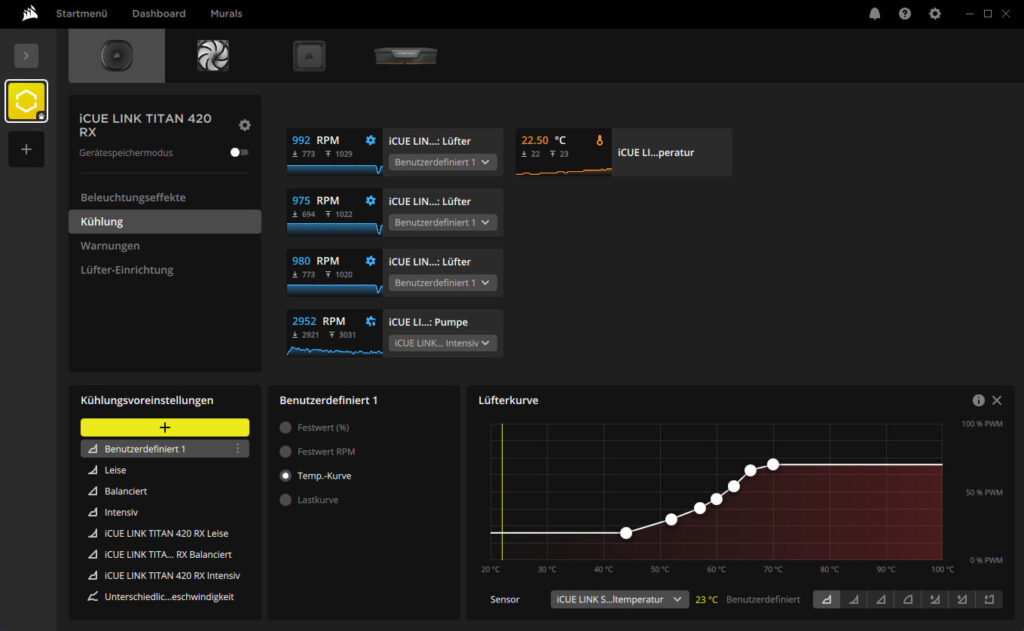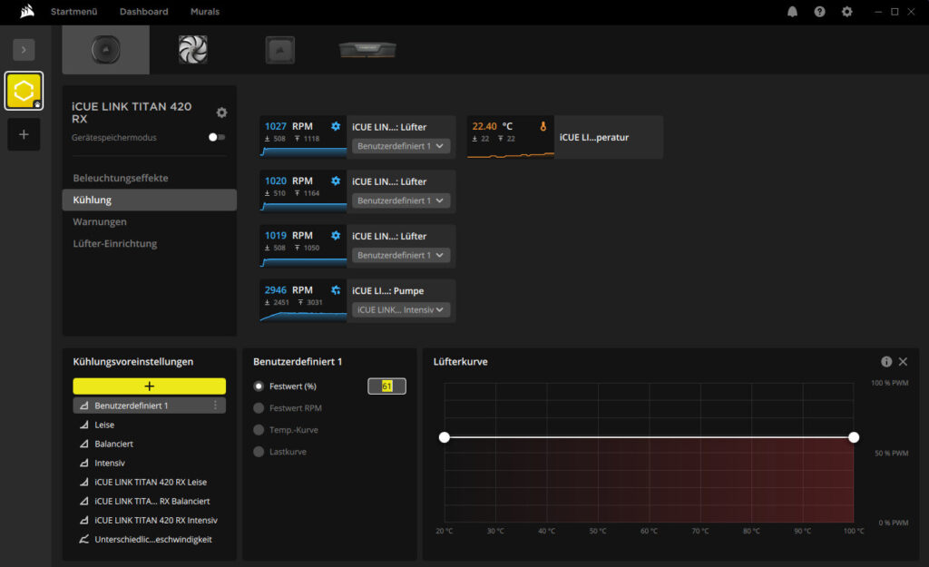 Gesteuert wird alles und ausschließlich per iCUE-Software. Dabei ist besonders positiv zu erwähnen, dass die Flüssigkeitstemperatur angezeigt wird und als Quelle für die Lüftersteuerung verwendet werden kann. Man kann allerdings auch nach der CPU-Temperatur oder anderen Sensoren eine eigene Lüfterkurve einstellen.