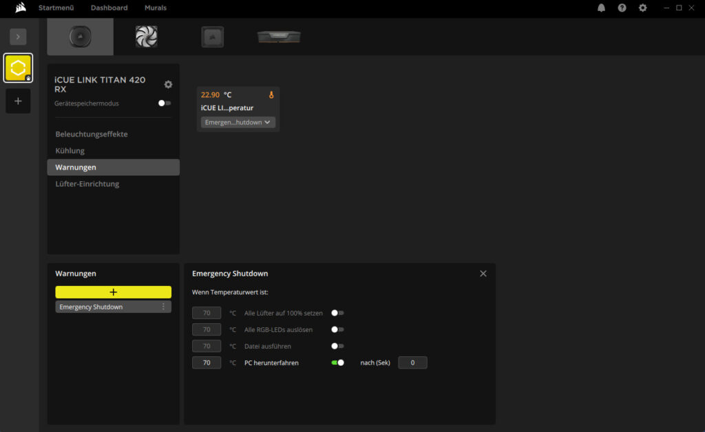 Es können wahlweise auch feste PWM- oder RPM-Werte eingestellt werden. Zudem gibt es die drei Profile Leise, Balanciert und Intensiv. Bei der Pumpe können keine eigenen Kurven eingestellt werden, hier muss man aus den drei festen Profilen wählen. Im Punkt „Warnungen“ kann man einstellen was beim Erreichen einer festgelegten Temperatur passieren soll, z.B. die Lüfter auf maximale Geschwindigkeit stellen, eine optisches Signal über die RGB-LEDs ausgeben und sogar ein Shutdown ist möglich.