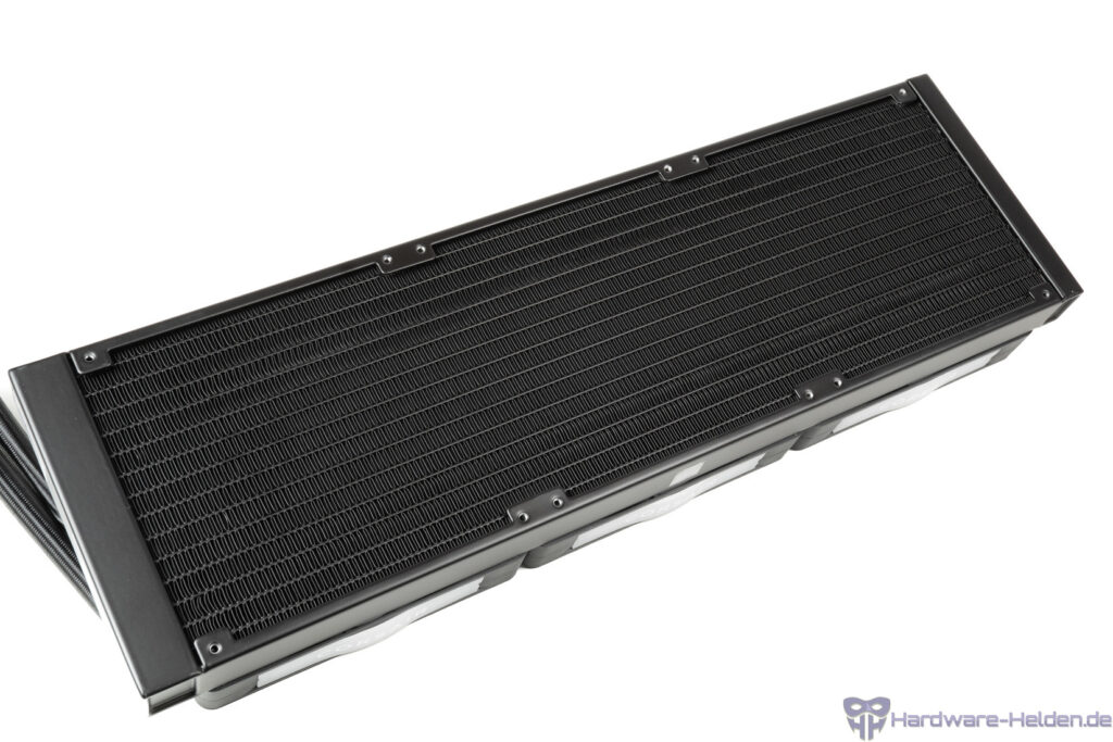 Der 420-mm-Radiator ist wie gewohnt aus Aluminium gefertigt. An der Verarbeitung des 27 mm hohen Radiators gibt es nichts auszusetzen. Unser Exemplar hatte keine größeren Verformungen der Lamellen und war gleichmäßig lackiert.