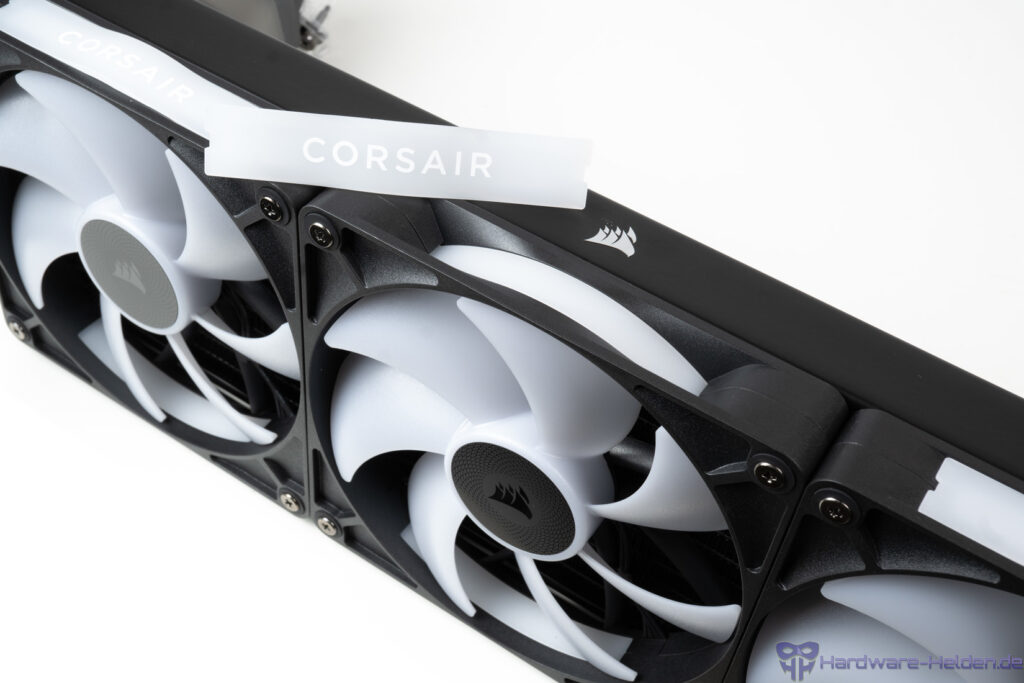 Sie bieten eine ARGB-Beleuchtung mittels 8 LEDs in der Nabe, die auch durch die Seiten strahlt. Die tauschbaren Seitenflächen, eine mit und eine ohne Corsair-Schriftzug, gab es bereits bei der 120mm-Version zu sehen.