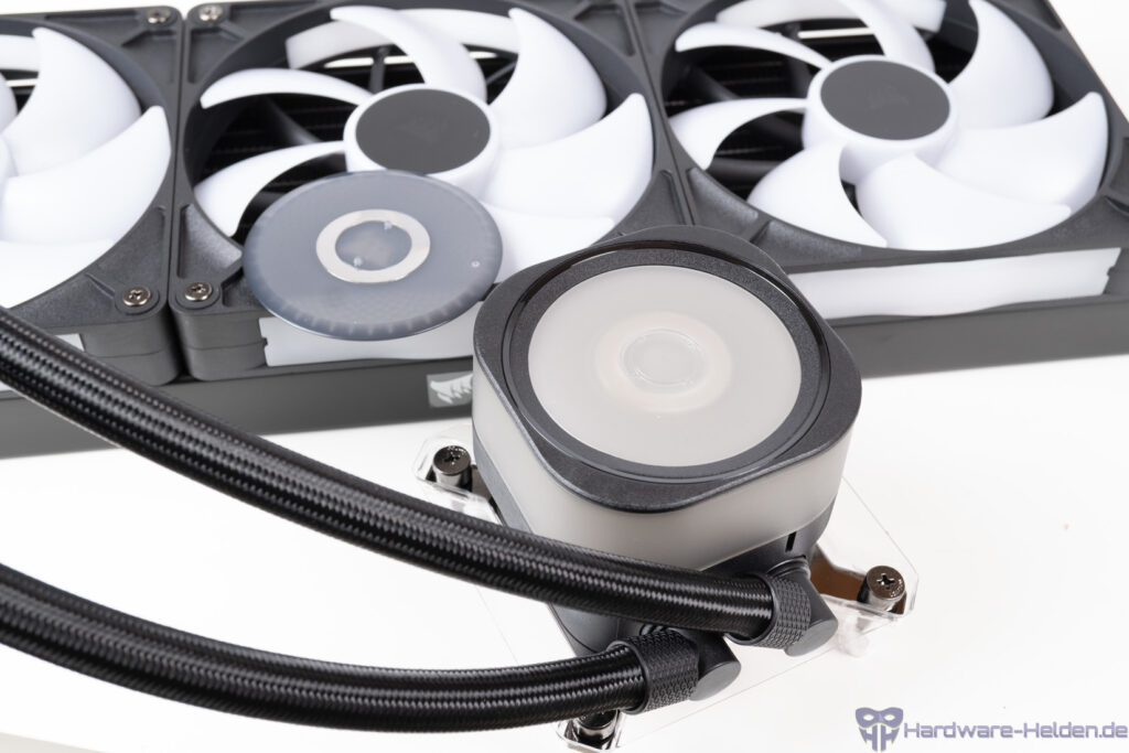 Auch der Pumpendeckel ist beleuchtet, dort sind stolze 20 LEDs verbaut. Die Logoplatte ist drehbar. Man kann den Deckel gegen separat erhältliche CapSwap-Module tauschen und die AiO dann beispielsweise mit einem VRM-Lüfter für das Sockelumfeld oder mit einem Display aufwerten.