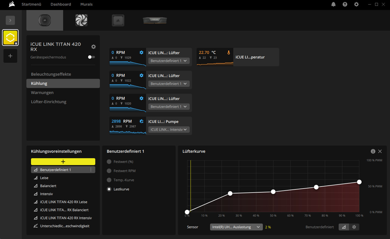 Gesteuert wird alles und ausschließlich per iCUE-Software. Dabei ist besonders positiv zu erwähnen, dass die Flüssigkeitstemperatur angezeigt wird und als Quelle für die Lüftersteuerung verwendet werden kann. Man kann allerdings auch nach der CPU-Temperatur oder anderen Sensoren eine eigene Lüfterkurve einstellen.