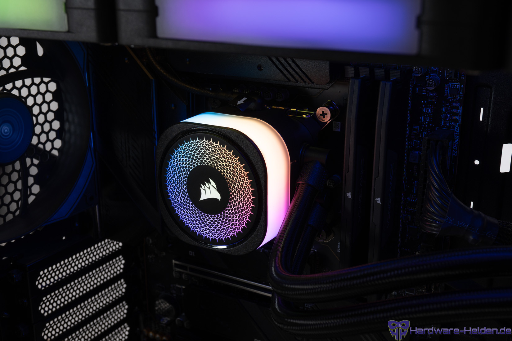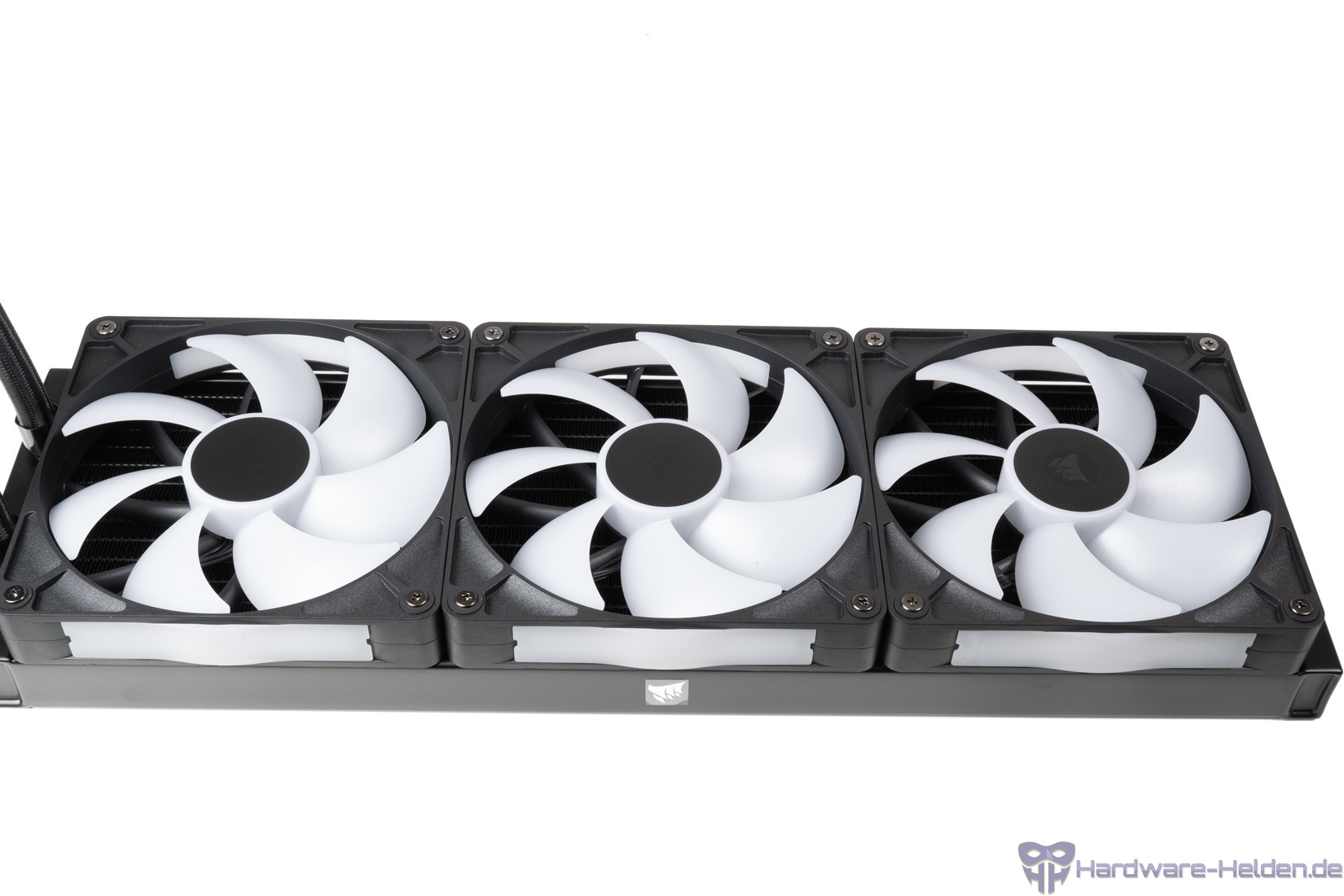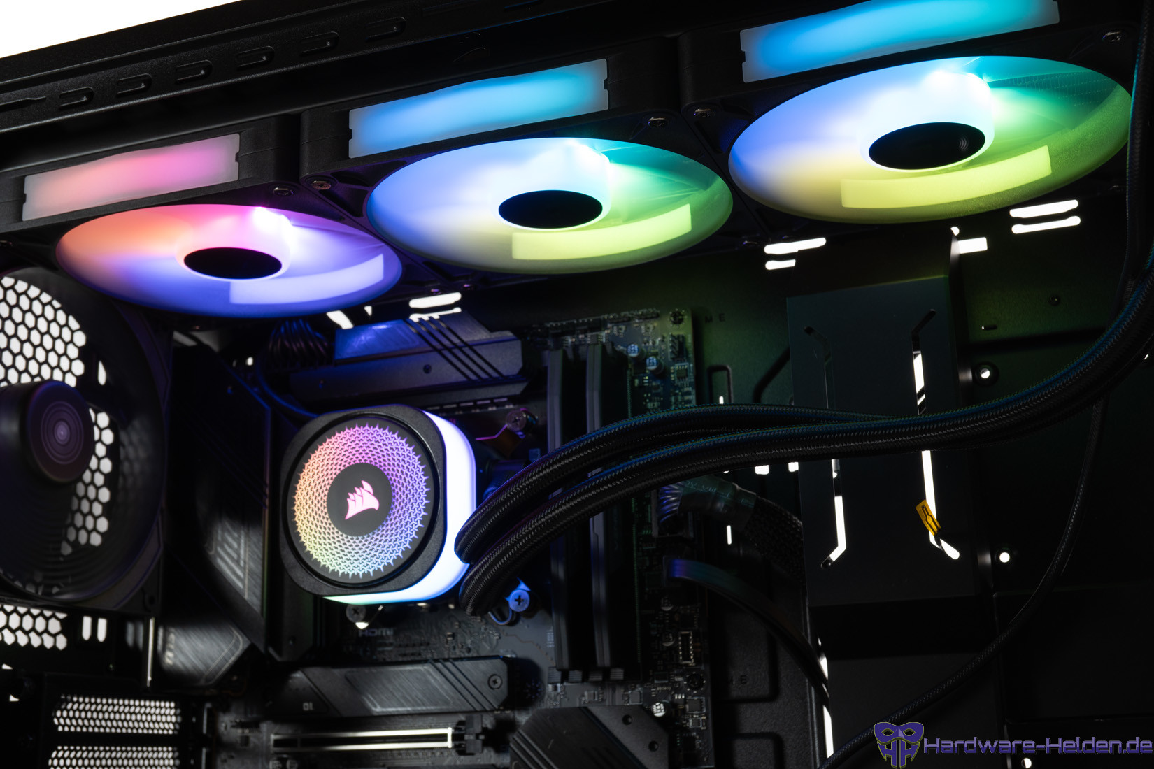 Dank iCUE-Software sind sehr viele Beleuchtungseffekte möglich, auch wenn sich die aktive Beleuchtung nur auf die Mitte der Lüfter beschränkt. Die Lüfter sind ohne weitere Kabel direkt mit einem Stecksystem miteinander verbunden.