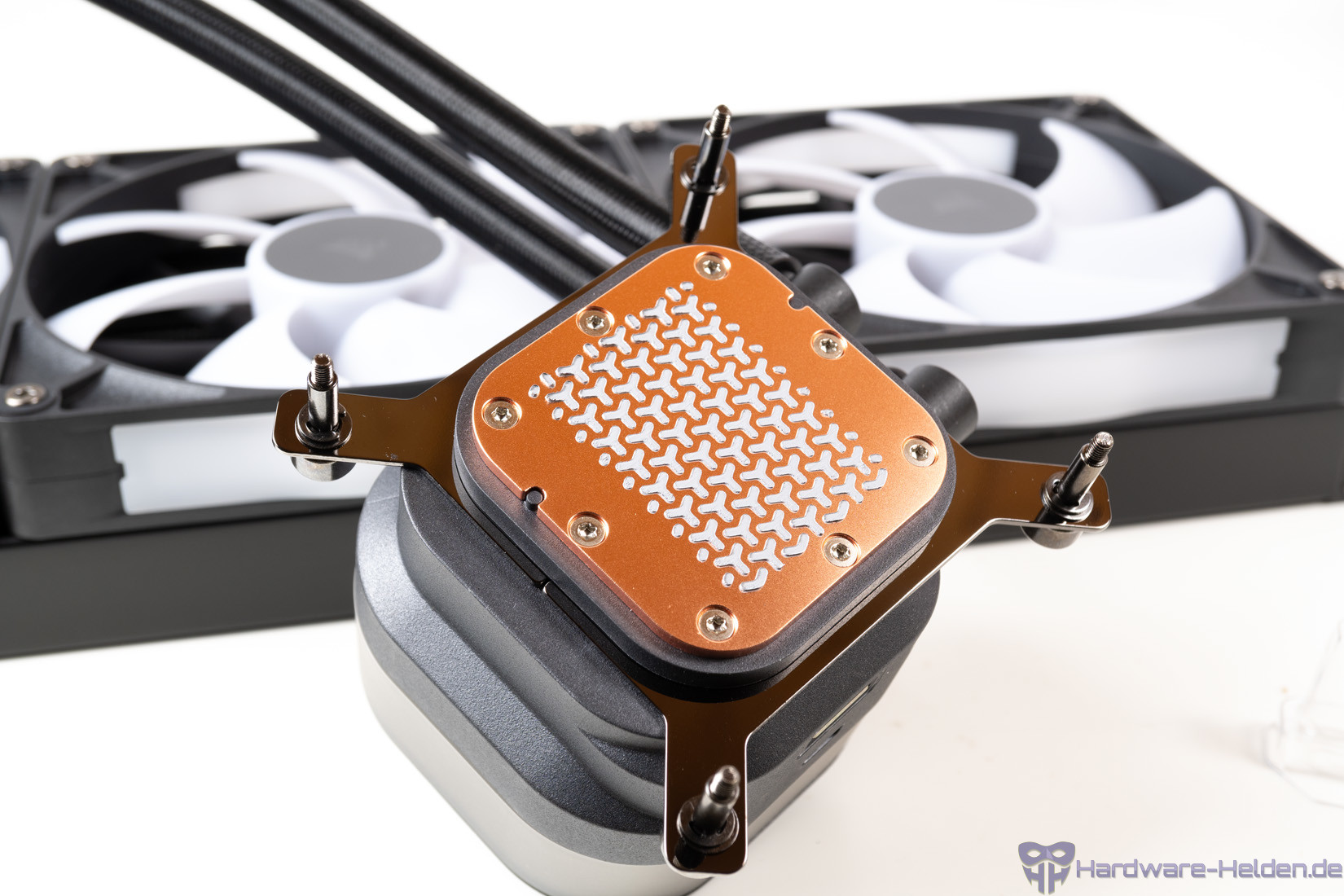 Auch der Pumpendeckel ist beleuchtet, dort sind stolze 20 LEDs verbaut. Die Logoplatte ist drehbar. Man kann den Deckel gegen separat erhältliche CapSwap-Module tauschen und die AiO dann beispielsweise mit einem VRM-Lüfter für das Sockelumfeld oder mit einem Display aufwerten.
