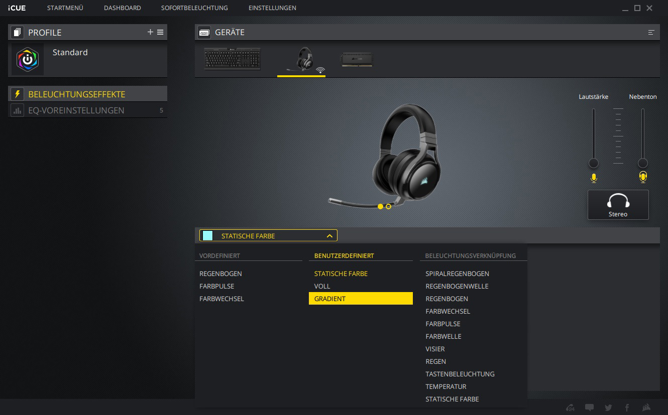 Durch die Installation von Corsairs iCUE Software erhält der Nutzer neben Lautstärkeregelung vom Mikrofon und verschiedenen Beleuchtungsmöglichkeiten auch Zugriff auf den Virtuellen 7.1 Modus.