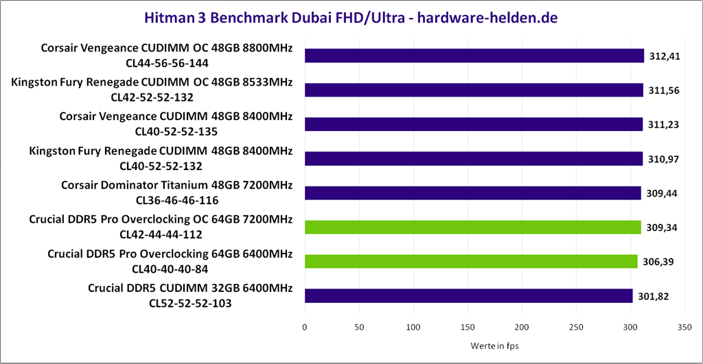 Als praxisnahen Test setzen wir auf den integrierten Dubai Benchmark von Hitman 3. Mit den Vielen dargestellten Personen und Physikeffekten zeigt sich der Test als sehr CPU lastig. Um nahe ans CPU-Limit zu kommen, aber ein reelles Szenario zu schaffen, haben wir bei FullHD Auflösung mit maximal möglichen Details getestet.