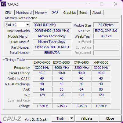 Der RAM besitzt sowohl AMD EXPO als auch Intel XMP 3.0 Profile und sieht hier einen Takt von 6400MHz vor. Dabei sind die Timings mit CL40-40-40-84 eher hoch angesetzt, im Gegenzug werden dafür aber auch nur 1,35V Spannung benötigt.