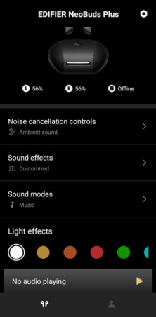 Die Edifier Connex App bietet einen hohen Funktionsumfang, will aber zunächst etwas ergründet werden. Auf der Startseite gibt es eine schnelle Übersicht über den Akkustand inkl. der des Cases, den Zugriff auf ANC, eine schnelle Klanganpassung und die Farbe der Beleuchtung am Gehäuse kann ausgewählt werden.