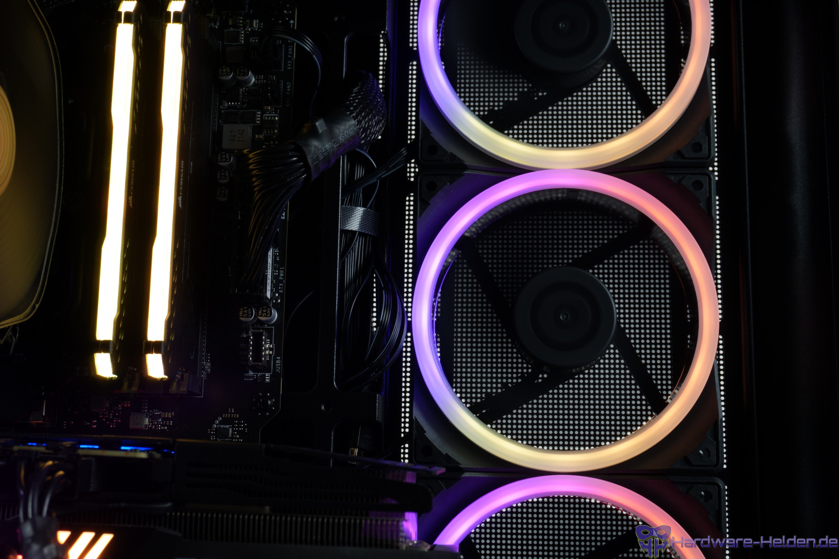 Die Optik wird mit den vier Corona-Lüftern mit den breiten beleuchteten Ringen ergänzt. Dank ARGB/PWM-Platine(n) lassen sich diese gemeinsam steuern und noch erweitern, auch wenn die doppelt vorhandenen Platinen etwas unelegant scheinen. Während die Lüfter bei der Lautstärke punkten und sich auch flüsterleise betreiben lassen, konnte die Kühlleistung ab Werk bei uns nicht überzeugen.