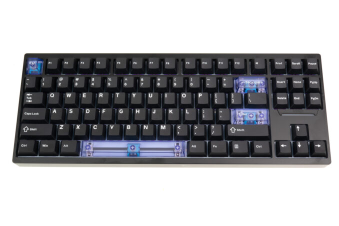 Die Magcore 87 von Epomaker ist also eine Tastatur im platzsparenden TKL-Format, bei der auf den ersten Blick die vier blau-durchsichtigen Tastenkappen auffallen. Wem das zu auffällig ist, kann sie gegen die schlichten schwarzen aus dem Lieferumfang tauschen.