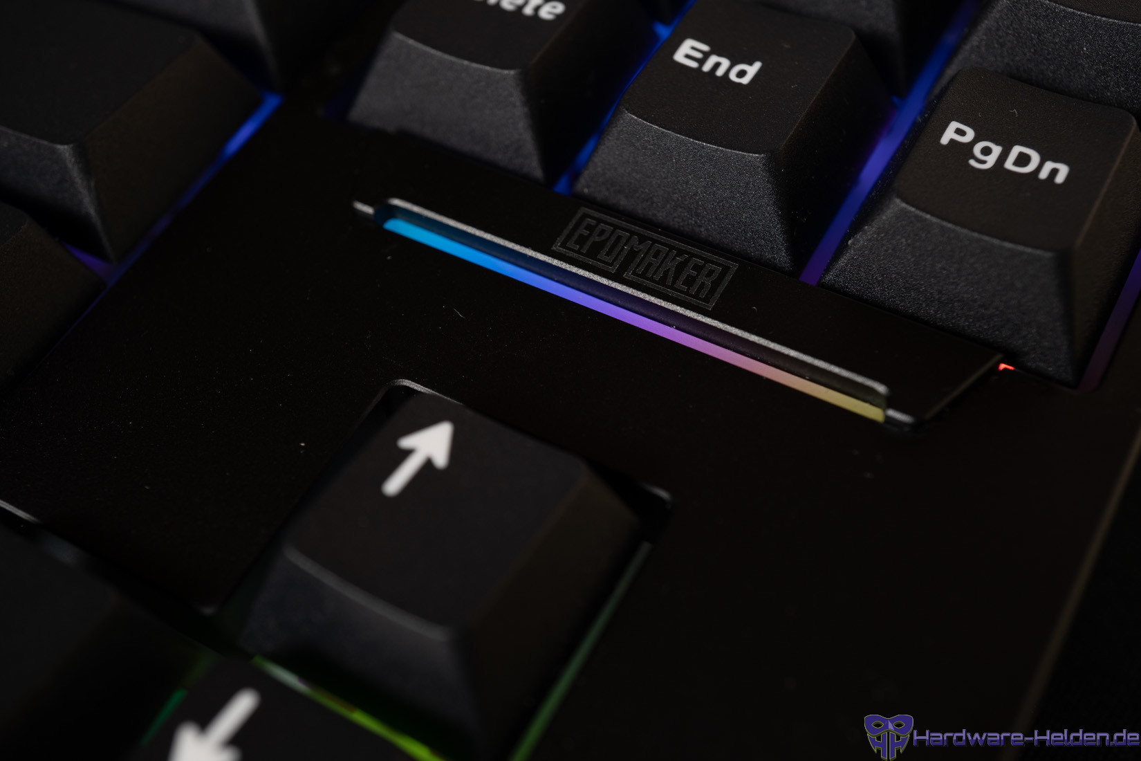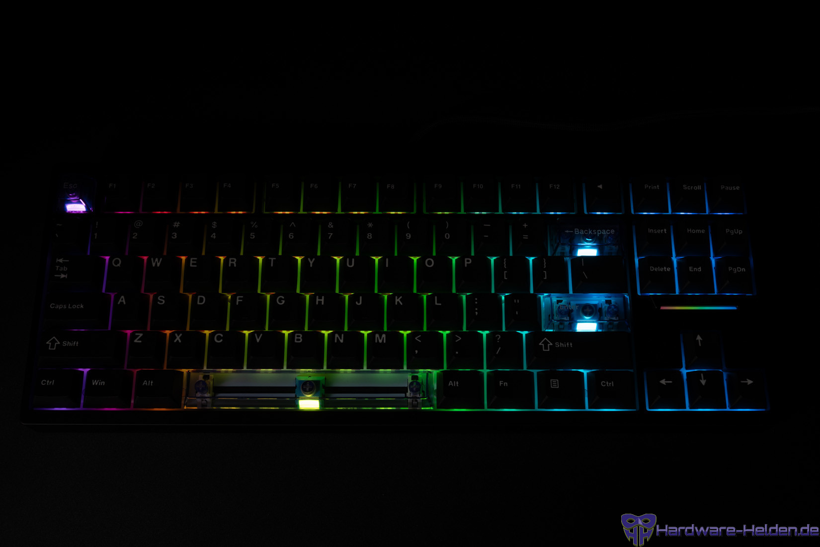 Das Design ist beim Gehäuse schlicht, eine kleine Plakette über den Pfeiltasten ist ein kleiner Hingucker. Der dortige RGB-Streifen kann mittels Tastenkombi verändert/deaktiviert werden. Die Tastenbeschriftung wird durch die sonstige Beleuchtung allerdings nicht erfasst. Wie schon bei der kürzlich getesteten Epomaker TH99 ISO-DE sind die Caps nicht durchscheinend, so dass nur die Zwischenräume beleuchtet werden. Sonderfunktionen sind nicht aufgedruckt, die Anleitung hilft. Die fehlende Caps-Lock-LED wird durch die Beleuchtung unter der Taste ersetzt, ist bei aktiver RGB-Beleuchtung aber schwer zu erkennen.