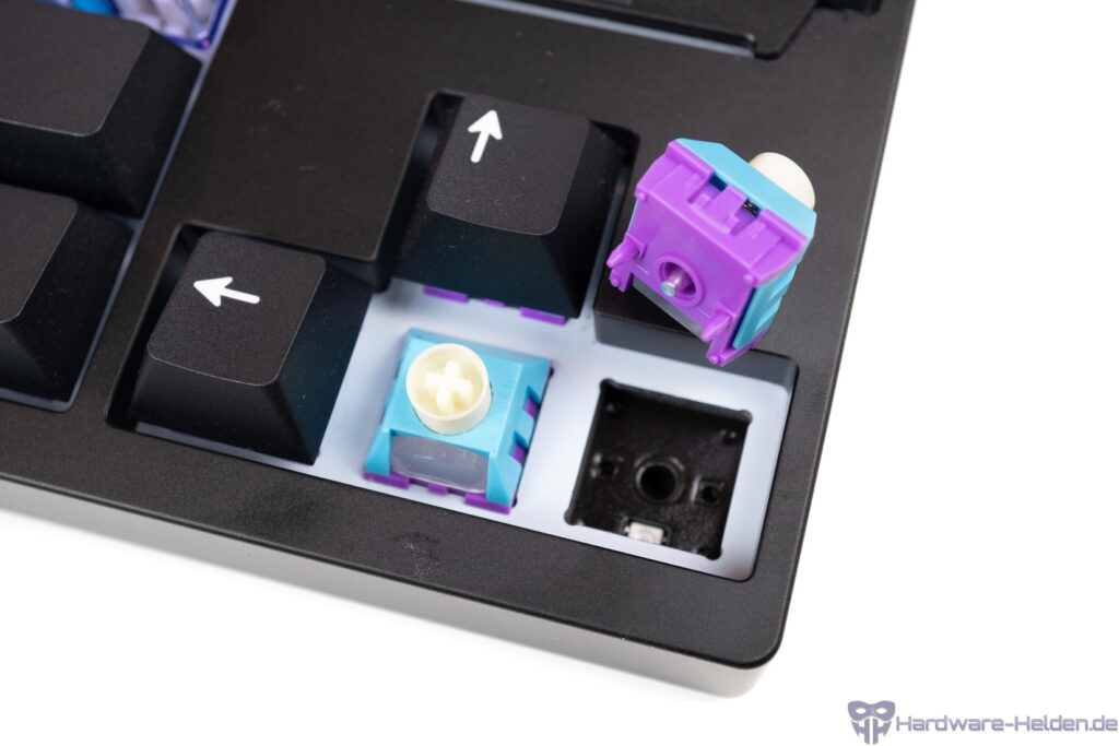 Die schwarzen Tastenkappen sind im Double-Shot-Verfahren gefertigte PBT-Caps, die laut Messschieber eine Wandstärke von ~1,4mm haben. Schenkt man dem Werkzeug glauben, ist das minimal unterdurchschnittlich im Vergleich zu dem, was wir meist in Tests gesehen haben. Fertigungsverfahren und Material versprechen aber Haltbarkeit und sie werden auch nicht direkt „speckig“, wie man es von ABS kennt. Die durchsichtigen Kappen sind glatter. Die dadurch sichtbaren, südseitigen LEDs sitzen unter einem bogenförmigen Diffusor, so dass sie zwar schon herausstechen, aber nicht störend blenden.