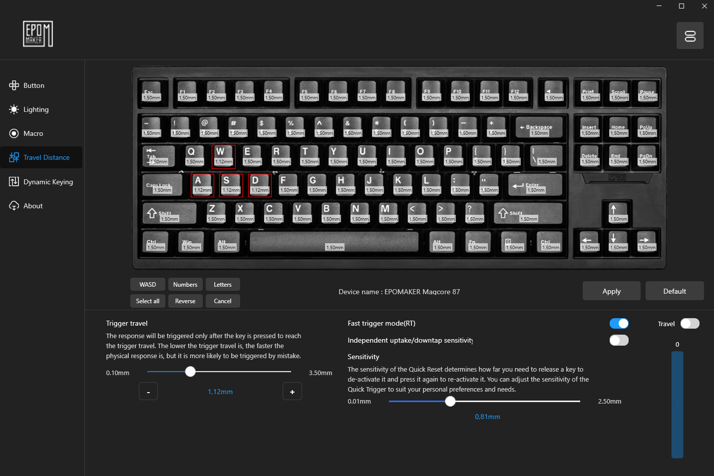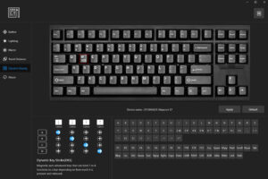 Die Fähigkeiten der induktiven Schalter können im Punkt „Travel Distance“ konfiguriert werden. Im linken Feld kann der Auslösepunkt zwischen 0,1 – 3,5 mm eingestellt werden. Im rechten Teil findet man Optionen für den Rapid-Trigger. Die Optionen werden auf Wunsch nur für bestimmte Tasten oder Bereiche oder die gesamte Tastatur eingestellt. Die jeweils eingestellte Distanz wird auf der Grafik angezeigt.