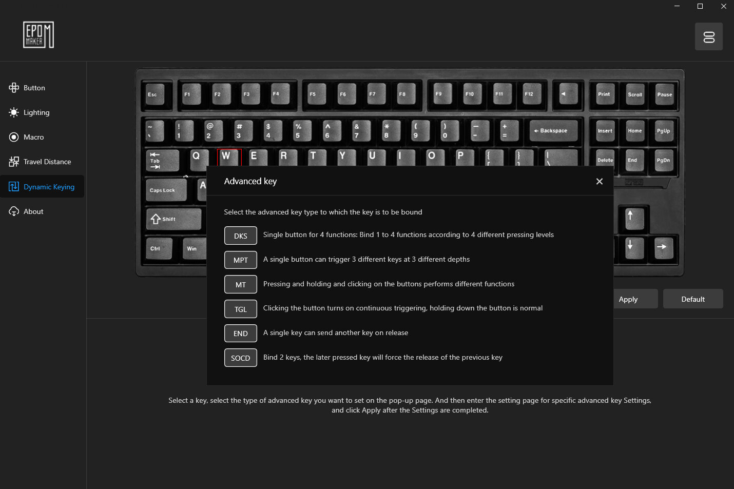 Der Punkt „Dynamic Keying“ ermöglicht es beispielsweise bis zu vier Optionen auf eine Taste zulegen. Je nachdem wie weit die Taste heruntergedrückt oder gelöst wird. Auch die SOCD-Funktion und weitere gibt es hier.