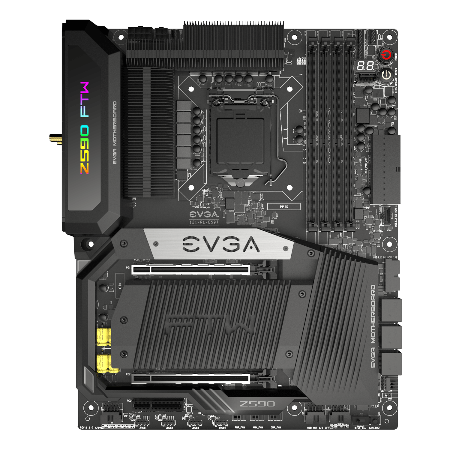Während das Z590 Dark die grenzen des ATX-Formats sprengt, bewegt das sich EVGA Z590 FTW WIFI innerhalb von diesem. Hier gibt es eine 17-Phasen VRM Design und Support für Speichergeschwindigkeiten von 4800MHz+, sowie eine hohen Anzahl („excessive number“) an USB-Anschlüssen. Auch mehrere ARGB-Header sind mit an Bo(a)rd.