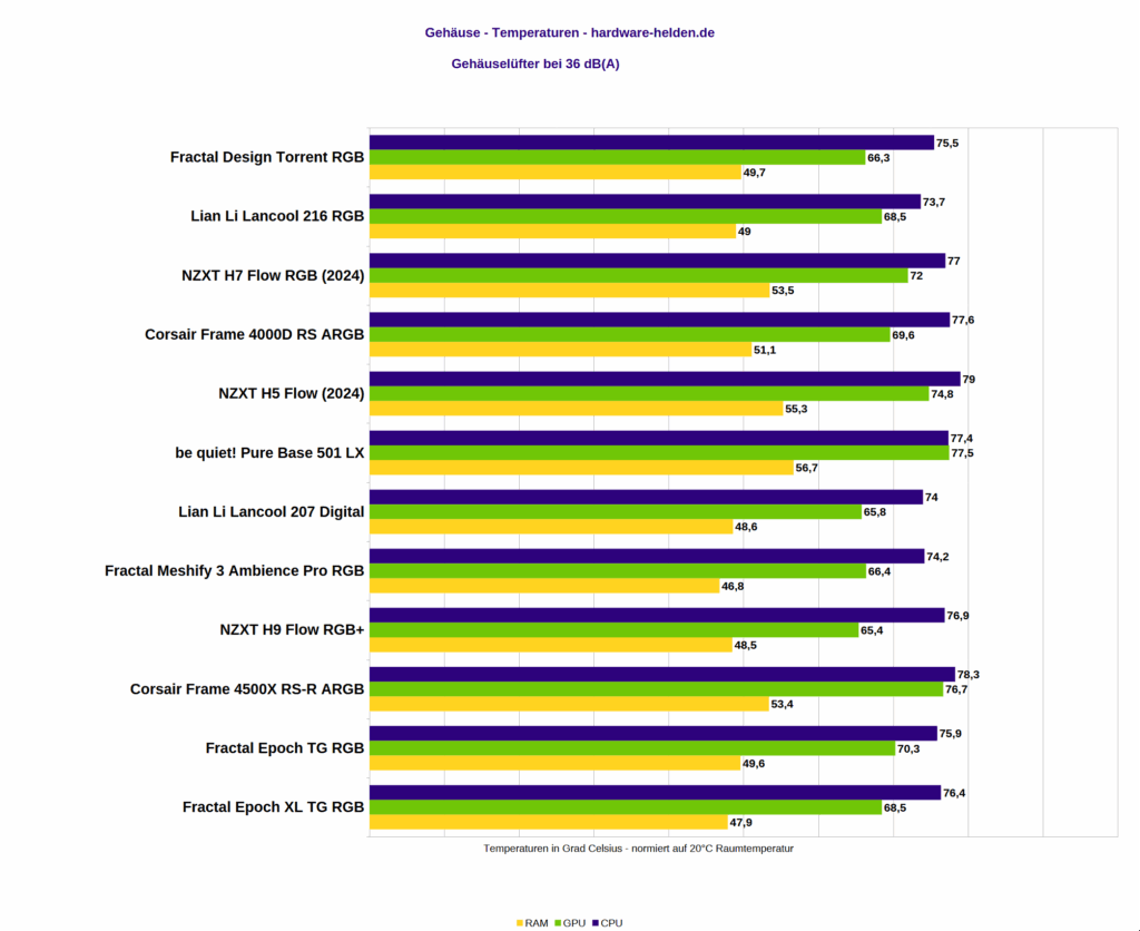 Als Software dienen prime95 (12k ohne AVX) für die CPU und MSI Kombustor für die GPU. Jeder Testlauf ging 10-Minuten nach einer Aufwärmzeit von 30 Minuten. Die Werte sind der jeweilige Durchschnittswert dieser 10 Minuten, normiert auf 20 Grad Raumtemperatur. Für die Messung bei gleichem Schalldruck werden die Gehäuselüfter auf 36 dB(A) reguliert (30 cm Abstand schräg von vorn). CPU-Lüfter und Grafikkartenlüfter werden auf 36 und 40 dB(A) fixiert. Die Gehäuse wurden jeweils zweimal gemessen und der Durchschnittswert beider Durchgänge genommen.