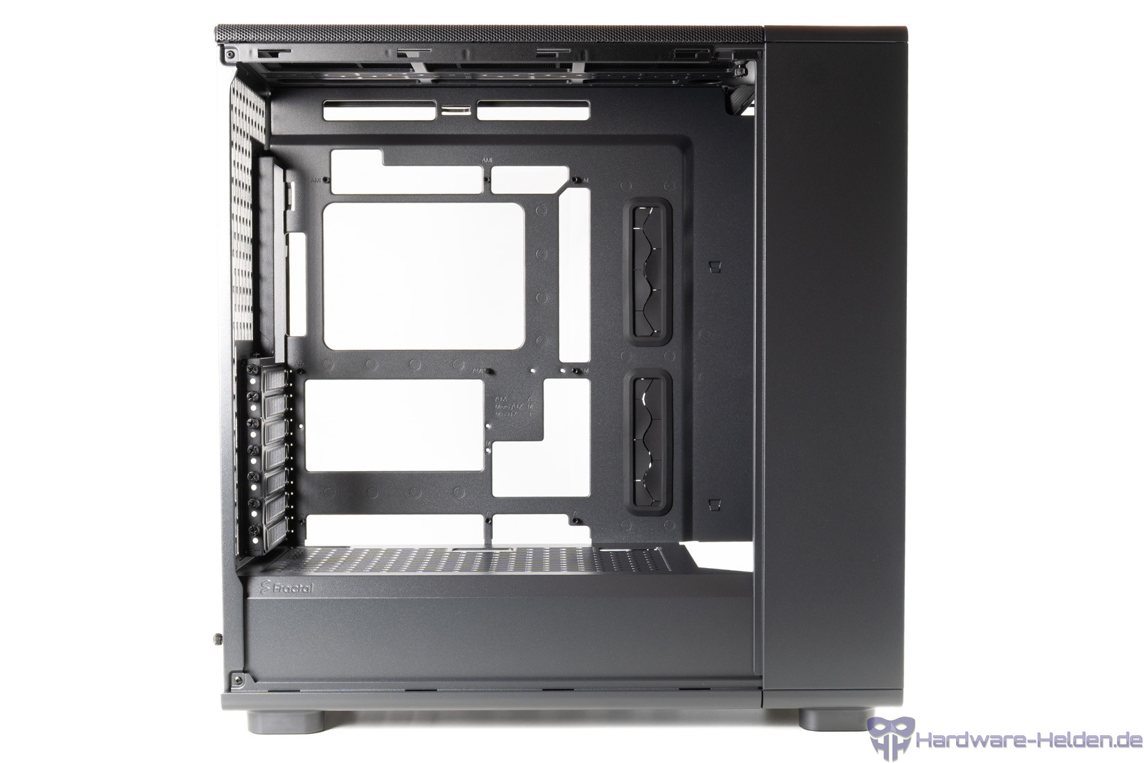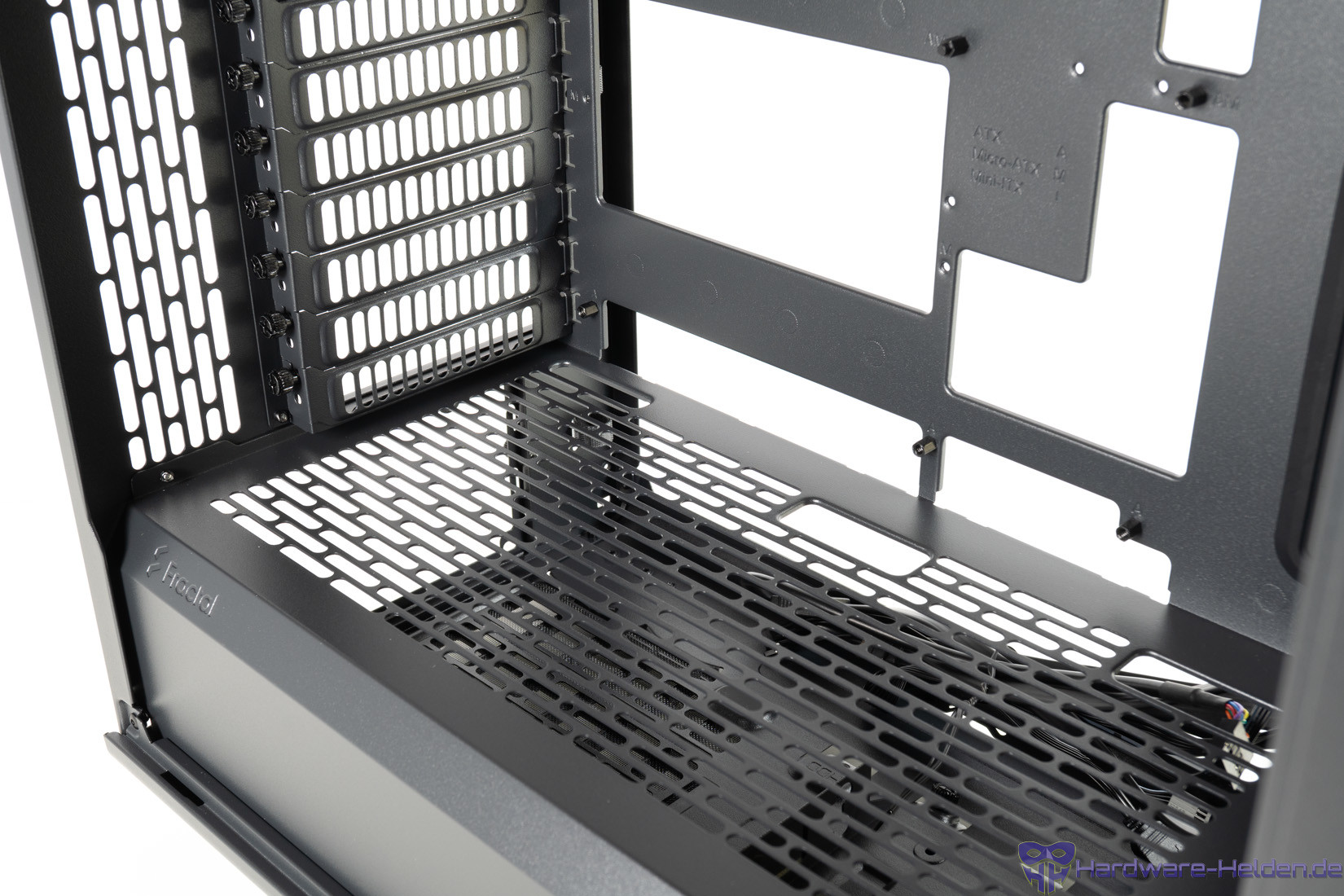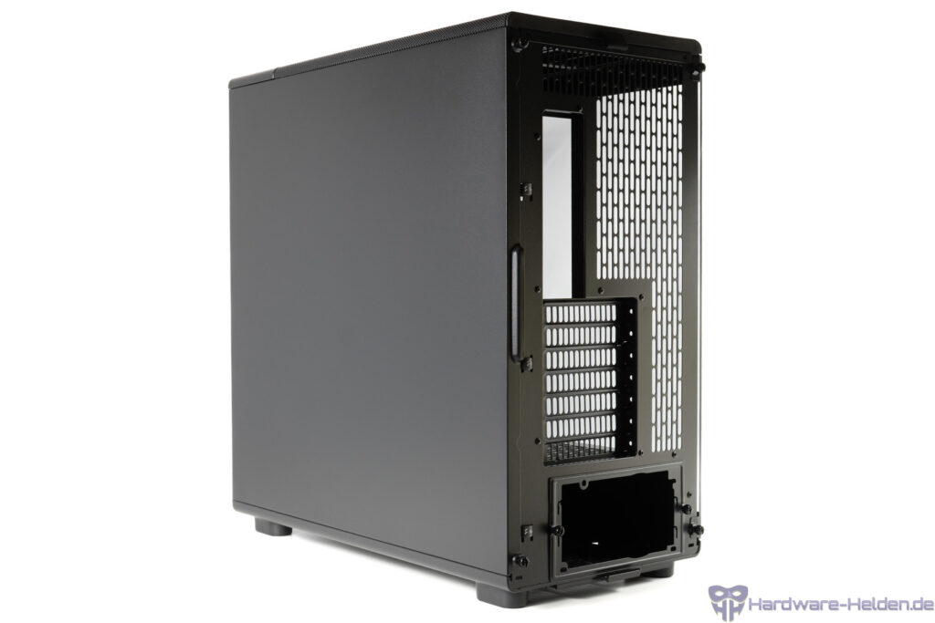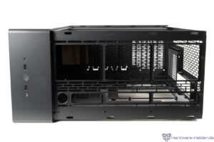 Die Rückseite bietet am Boden Platz für zwei HDDs, dessen Halterungen entnommen werden können. Der Platz für Netzteile fällt mit HDD-Halterungen mit 175 mm nun deutlich komfortabler aus als im kleineren Epoch. Im oberen Teil finden zwei 2.5 Zoll Laufwerke Platz.
