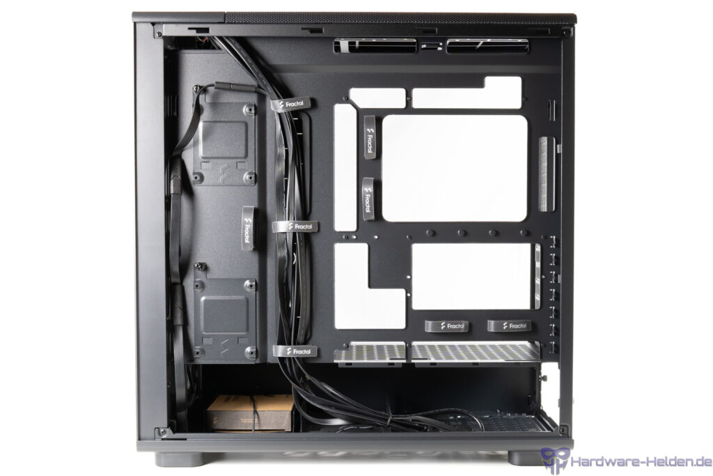 Der Rest der Rückseite dient der Kabelverlegung wozu mehrere Klettbinder am Mainboard-Träger platziert wurden – also nichts besonderes. Der Raum für Kabel beträgt bis zu 37 mm, sodass sich das Seitenteil in der Regel problemlos schließen lässt.
