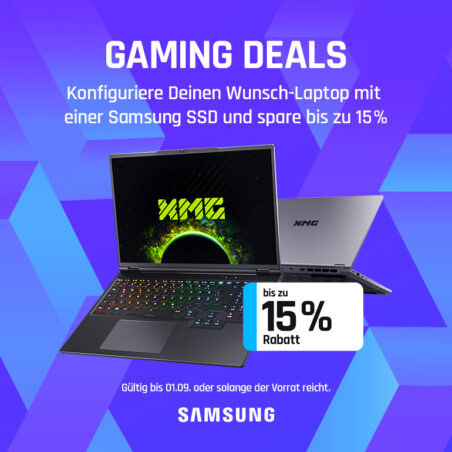 Die Gaming Deals auf bestware.com* starten am 18. August um 15 Uhr und laufen bis zum 01. September um 24 Uhr. Je nach Modell gibt es Rabatte zwischen 5 und 15 Prozent. Voraussetzung ist, dass die XMG-Laptops mit einer SSD von Samsung konfiguriert werden, die jedoch ohnehin Teil der Startkonfigurationen ist. Mit Ausnahme einer Sonder-Festkonfiguration des XMG PRO 16 (E25), sind alle XMG-Laptops frei konfigurierbar.