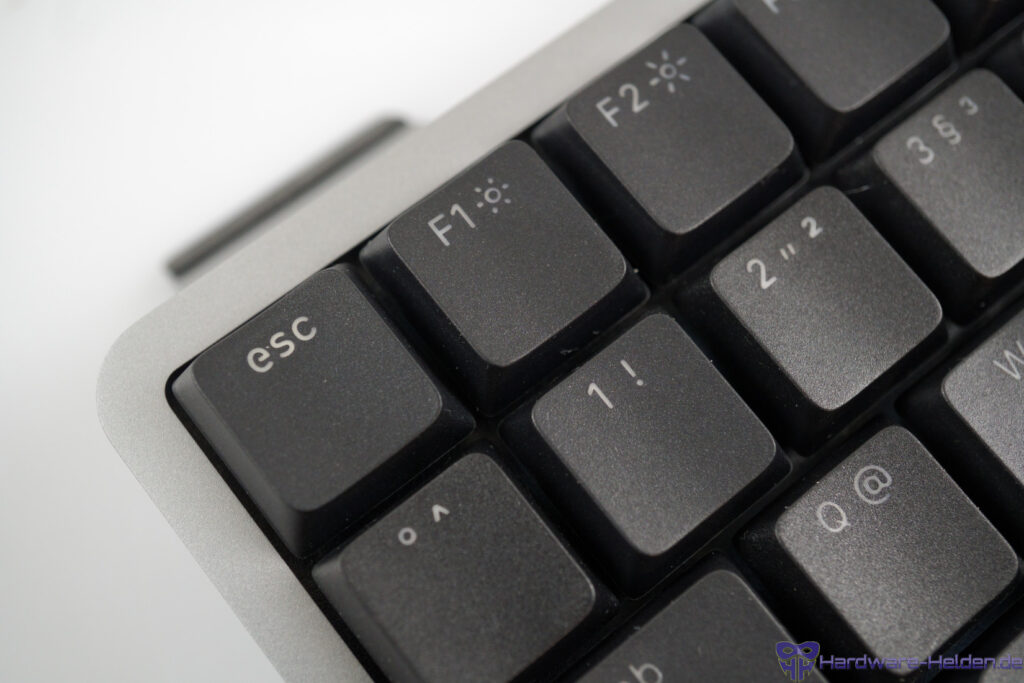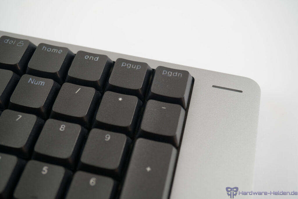 Der Funktionsumfang punktet mit drei Verbindungsmodi, hot-swap, Sonderfunktionen über die FN-Taste und sicherlich muss auch die Touchleiste genannt werden. Diese hat uns jedoch nicht gefallen und wir haben sie nach kurzer Zeit ausgeschaltet. Weitere Designentscheidungen die uns in kleinerem Maße nicht ideal gefallen haben sind die Position des USB-Anschlusses und der versteckte Power-Schalter. Deutlich mehr hat uns die kontrastarme Tastenbeschriftung gestört, was man mit der Beleuchtung – und damit zulasten der Akkulaufzeit – kompensieren kann.