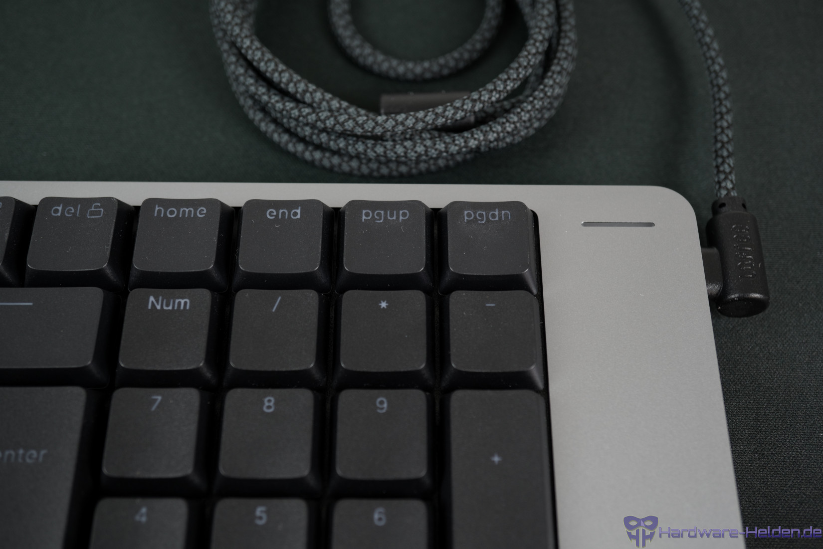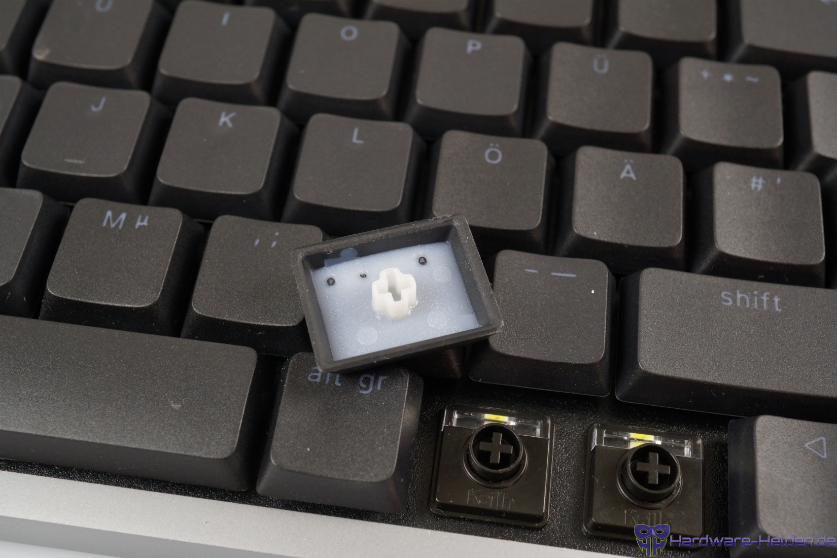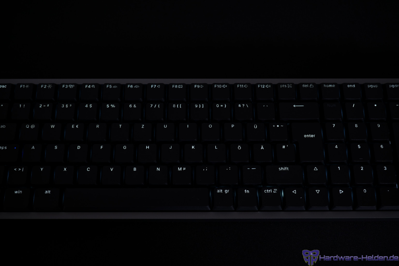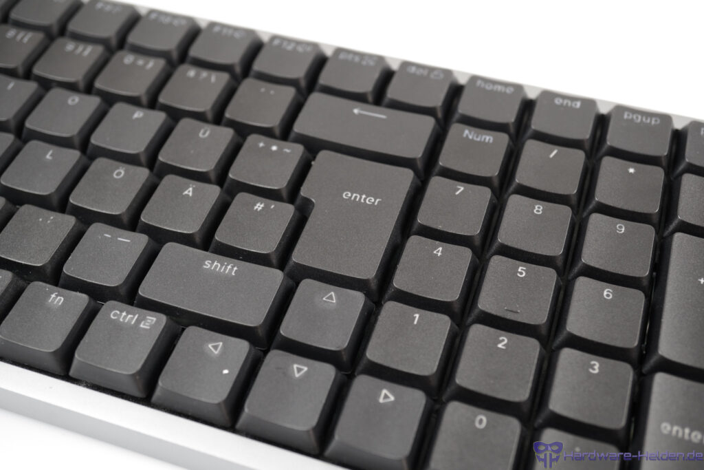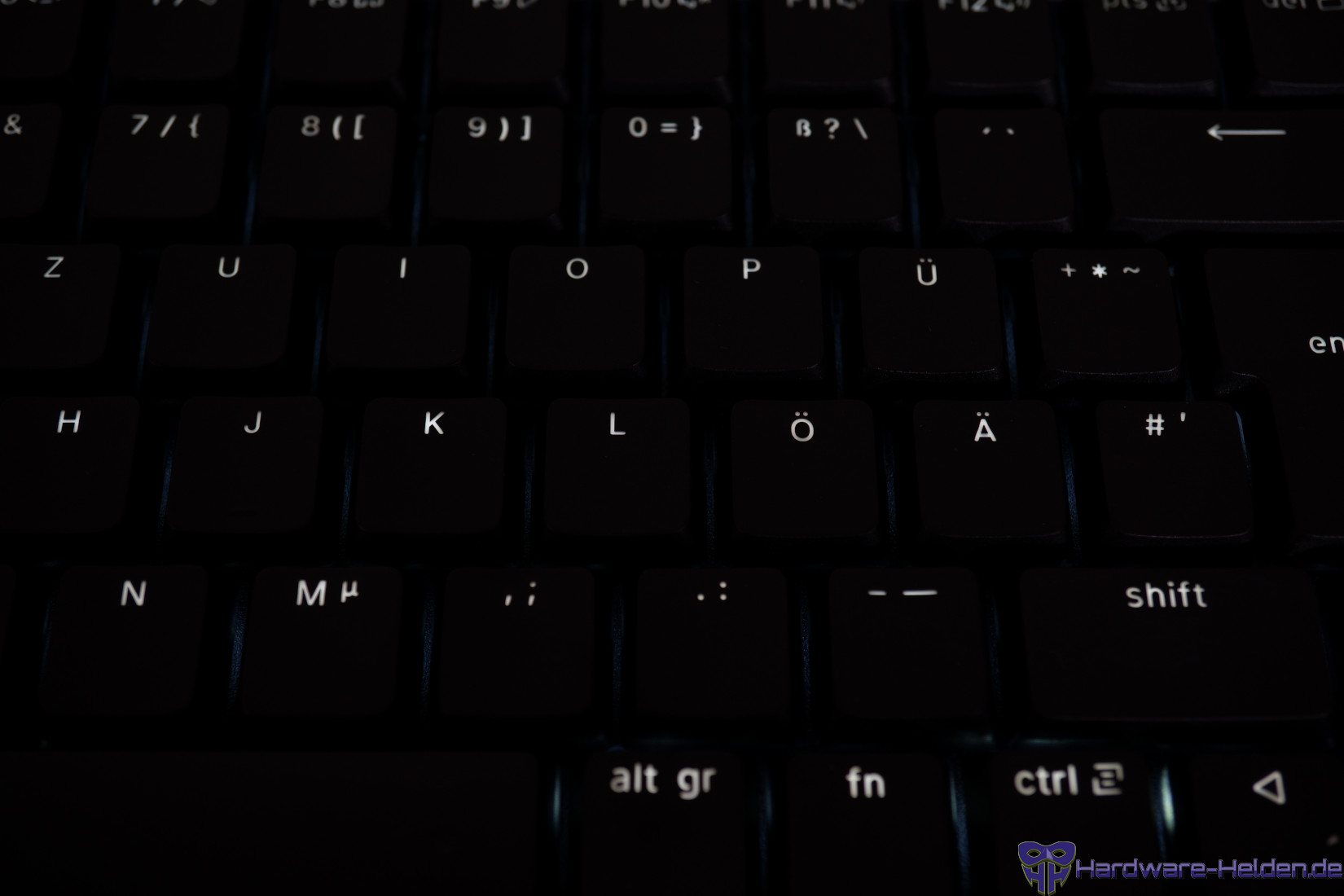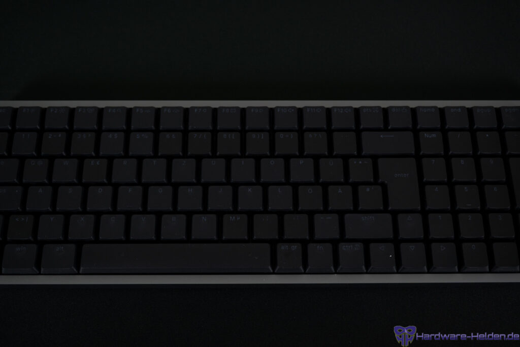 Die Tasten sind auch im deutschen Layout englisch beschriftet. Die feine, weißgräuliche Beschriftung ist zu den dunklen Tastenkappen etwas sehr kontrastarm und je nach Licht nicht gut erkennbar.