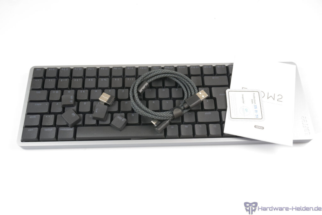 Die Flow2 100 von Lofree wird mit einem ummantelten USB-C-auf-USB-A-Kabel sowie einem USB-Empfänger geliefert, der sicher leider nicht an der Tastatur verstauen lässt. Weiterhin gibt es eine kurze Anleitung und sowohl Tasten für das Mac- als auch das Windowslayout. Ab Werk läuft die Tastatur im Mac-Modus und muss per Tastenkombination FN+N umgestellt werden, wenn man sie unter Windows benutzen möchte.