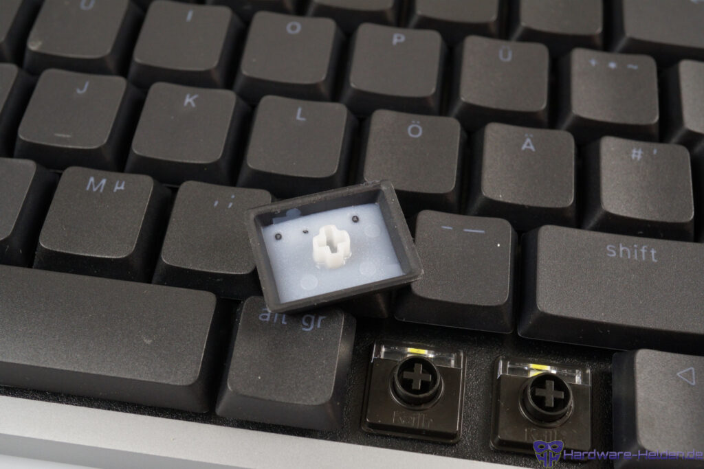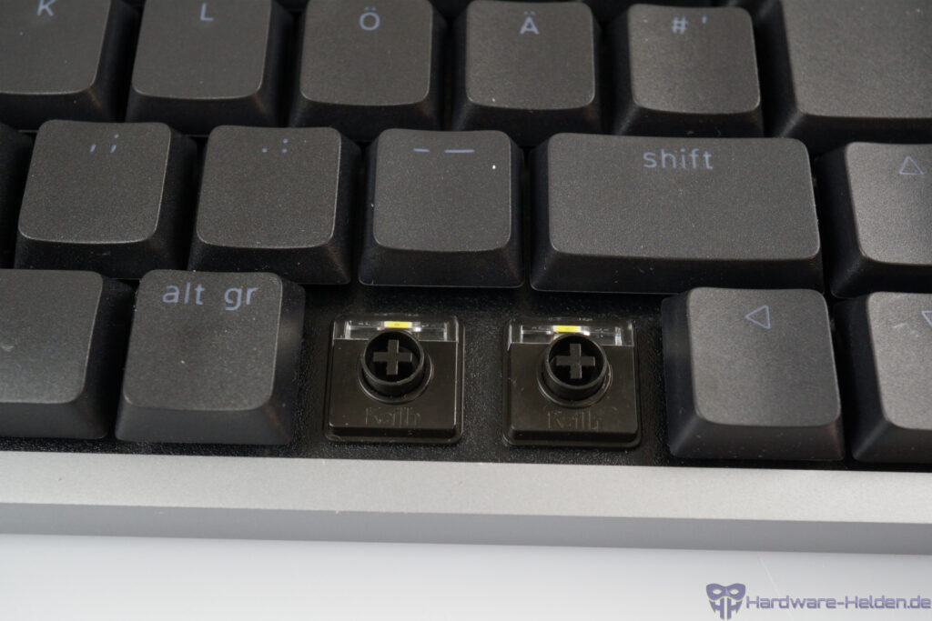 Wir haben also die taktilen Pulse-Schalter in unserem Modell. Der spürbare, markante, aber nicht grob ausfallende Widerstand gibt eine angenehme Kontrolle, die für ein sehr gutes Tippgefühl beim Schreiben von Texten sorgt. Vom spürbaren Widerstand abgesehen bewegen sich die Schalter sauber, aber eben fester als lineare Varianten. Es tippt sich mit dem 1,6 mm kurzen Auslöseweg dennoch recht zügig und präzise. Vereinzelt zeigte sich das gleiche Problem wie bei der Flow Lite84, dass sich breite Tasten am Rand sehr widerspenstig oder schwammig drücken. In diesem Fall waren die Caps- und die rechte Shift-Taste am meisten betroffen.